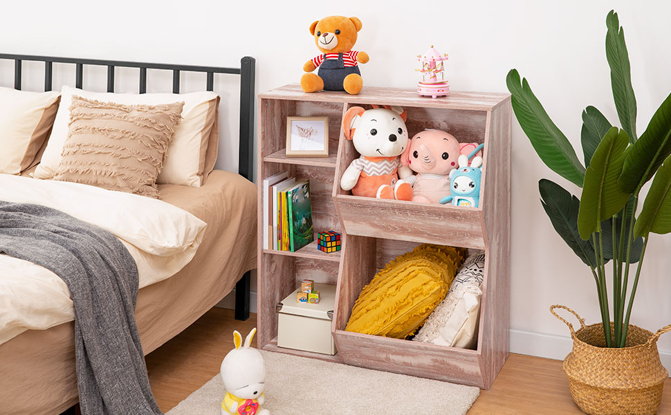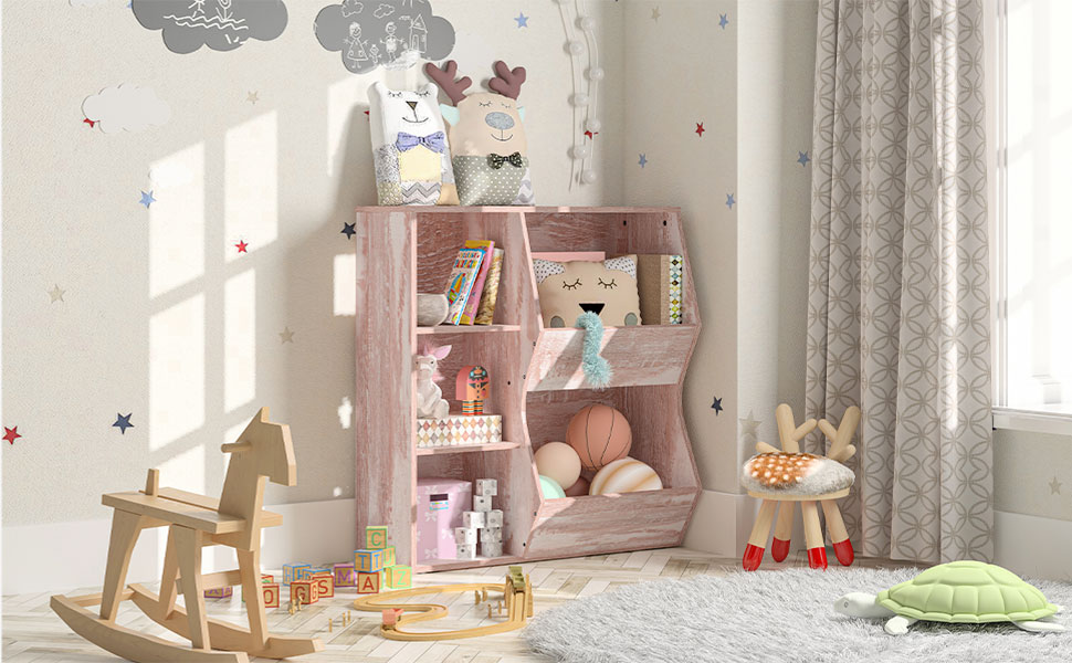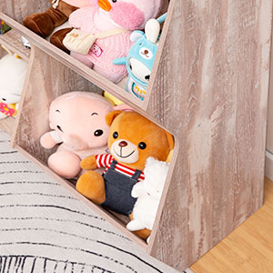 stabiel en vriendelijk ontwerp: de kinderboekenplank is gemaakt van hoogwaardig spaanplaat. de gekantelde bodemplaat van de opbergkast om te voorkomen dat speelgoed valt; antislip voetzolen en anti-kantelvoorzieningen zijn vriendelijk om te voorkomen dat de speelgoedopbergorganisator beweegt en kantelt om maximale veiligheid te garanderen