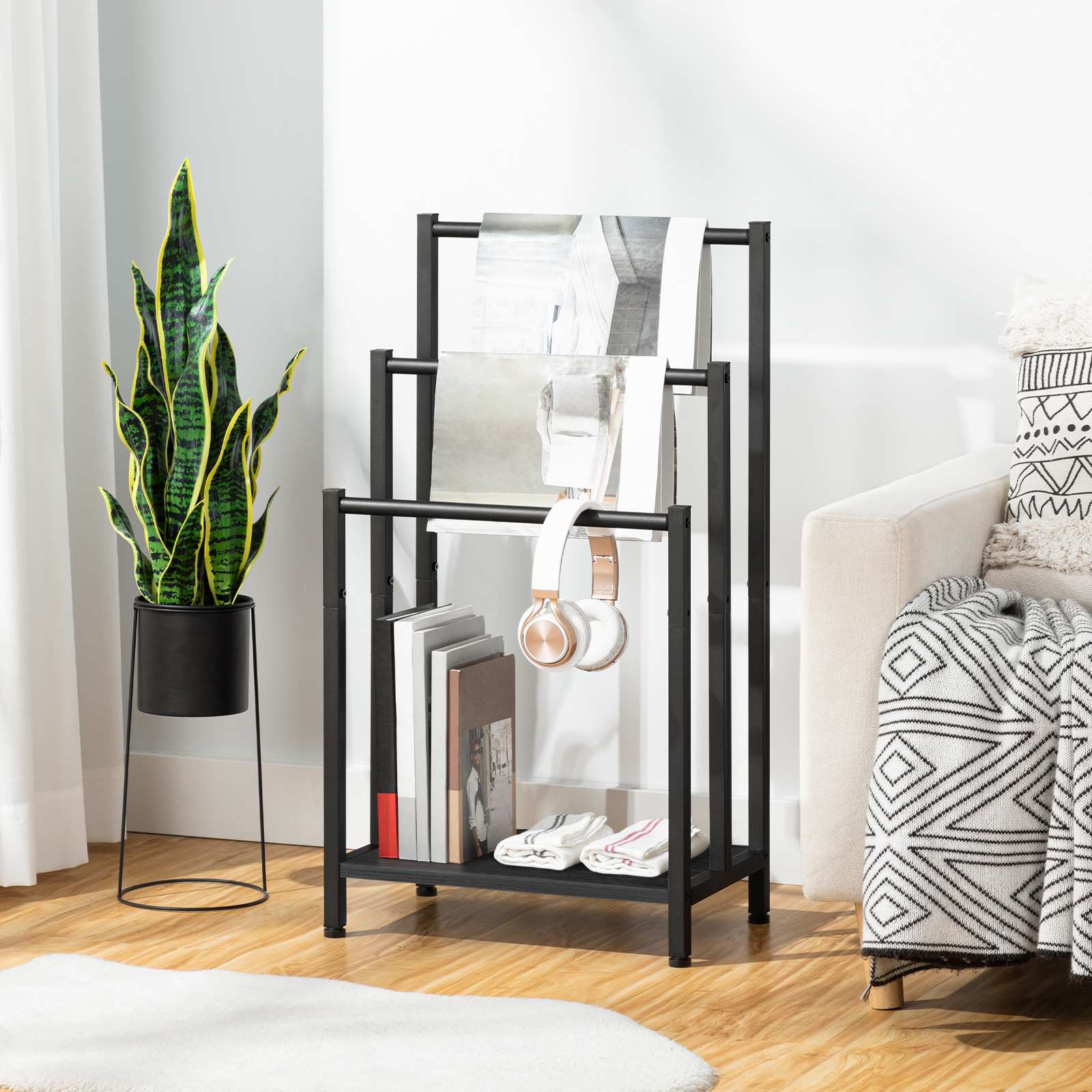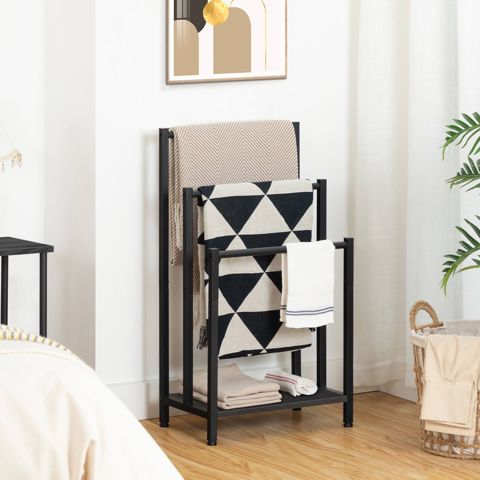 حامل مناشف قائم بذاته مكون من 3 طبقات, حامل بطانية معدني على الطراز الصناعي مع رف تخزين, تجفيف متعدد الوظائف & رف العرض للاستخدام المنزلي, لمسة نهائية سوداء