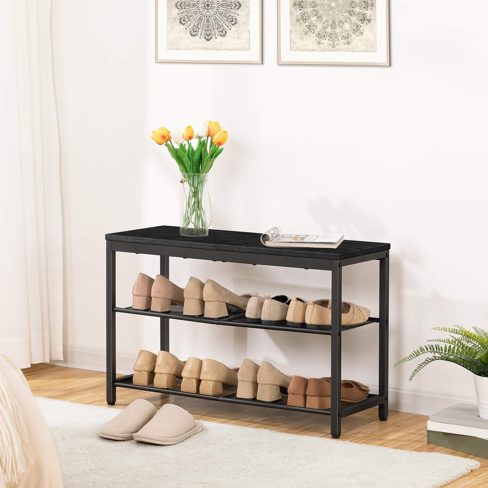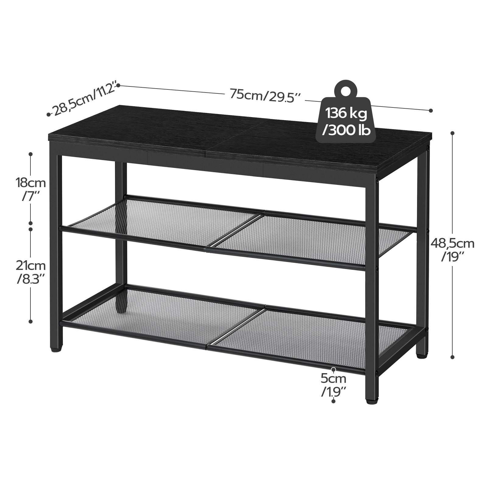 Dual-Functional Versatility: Integrating shoe rack and seating functions, this bench facilitates convenient shoe changing at entryways. Its top surface has a maximum load-bearing capacity of 136.08kg, and two mesh shelves effectively keep entryways tidy by organizing scattered footwear.