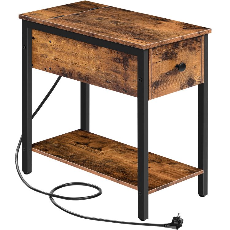 طاولة جانبية مع محطة شحن, طاولة بجانب السرير مع مقبس ومنفذ USB, طاولة أريكة مع درج, طاولة ديكور للمساحات الصغيرة, غرفة الجلوس, غرفة نوم, بني غامق
