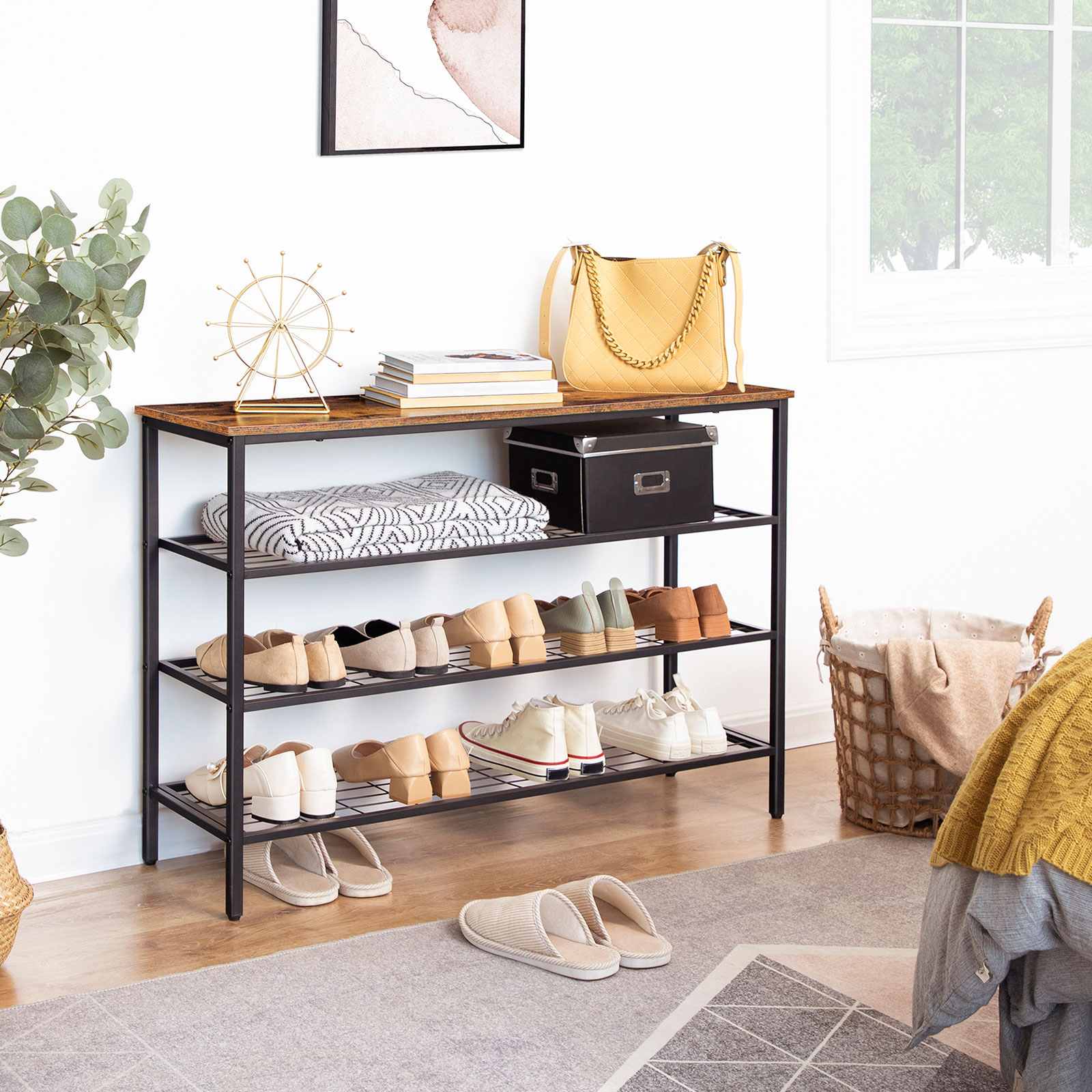 4-رف الأحذية الطبقة, منظم تخزين الأحذية على الطراز الصناعي مع 3 رفوف شبكية معدنية, مناسبة للمدخل, المدخل, خزانة وغرفة نوم, سهل التجميع, ريفي براون