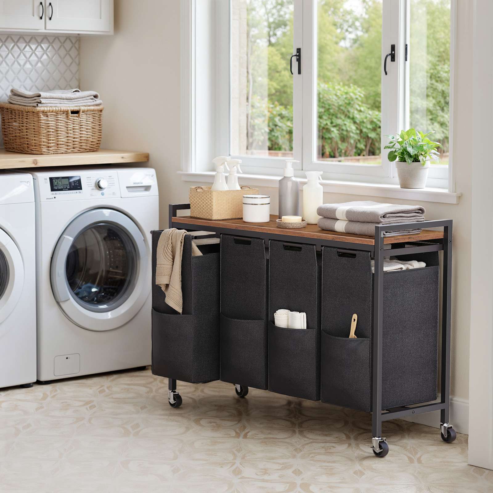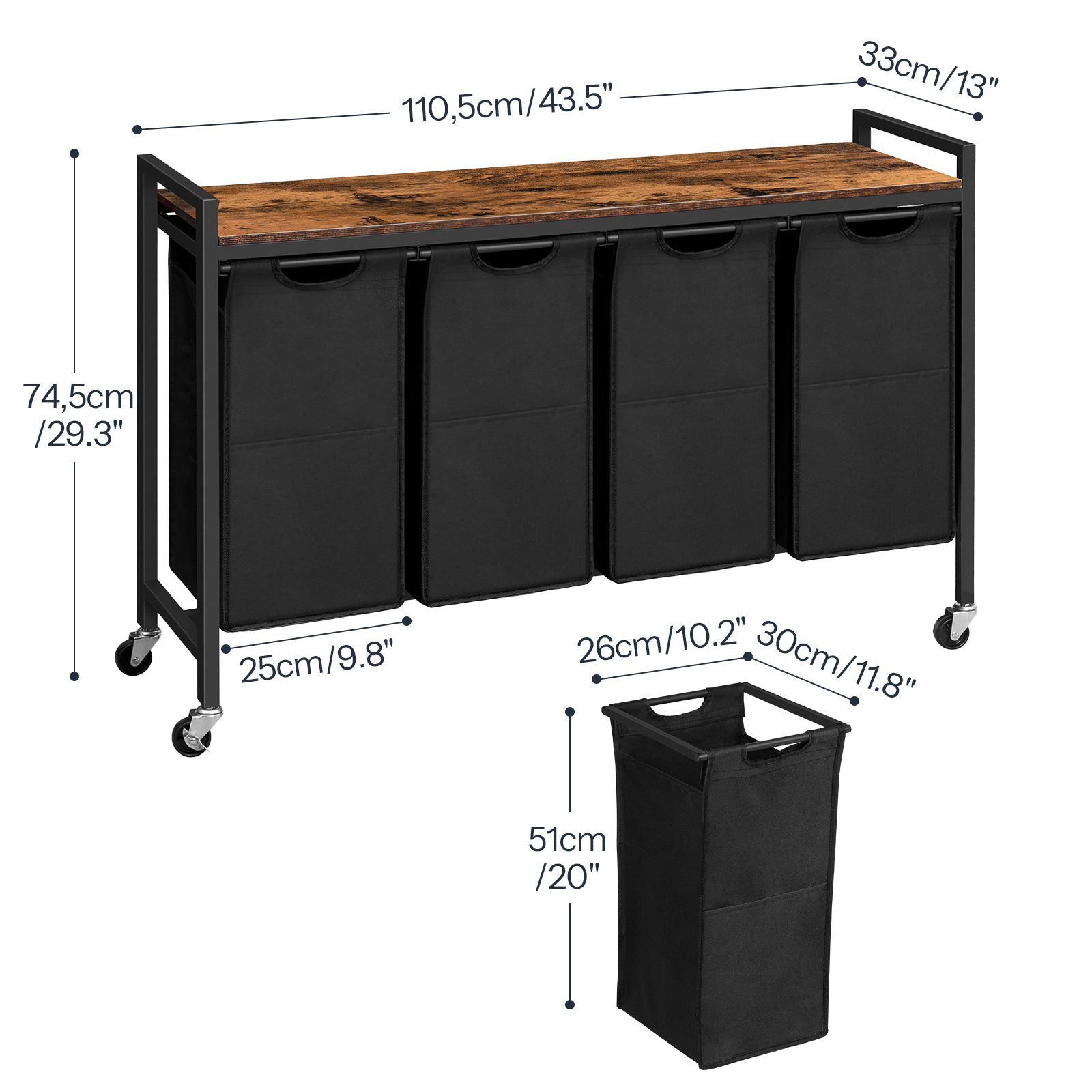 4-قسم سلة فارز الغسيل, عربة غسيل متدحرجة مع أكياس قماش أكسفورد قابلة للإزالة, 4 مقصورات (كل 39.8 لتر), عجلات قابلة للقفل, ريفي براون & أسود