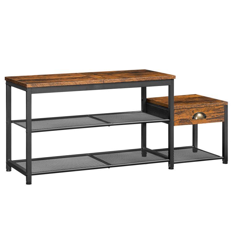 مقعد رف الأحذية مع الدرج, مقعد دخول الوالدين والطفل, منظم تخزين الأحذية مع مقعد, إطار معدني صناعي, للممر, بهو, ريفي البني والأسود