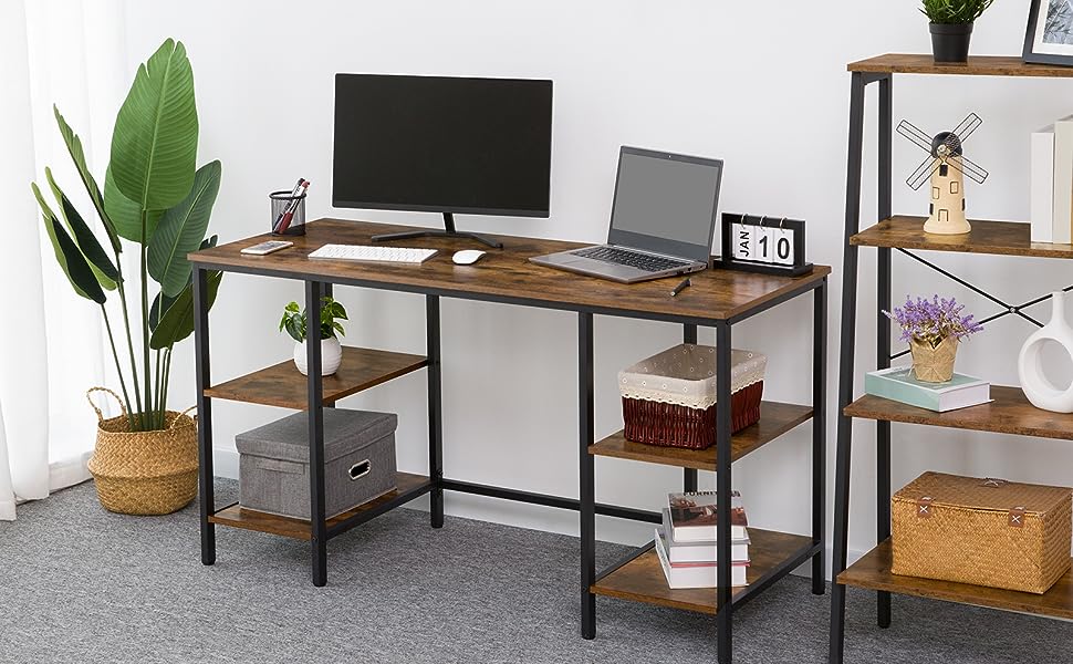 مكتب الكمبيوتر, محطة عمل كتابة المكاتب مع 2 أرفف التخزين اليسرى واليمنى, 53.9 س 21.7 س 29.5 مكتب كمبيوتر قوي بوصة, كبيرة ومستقرة, طاولة اللعبة للمكتب, يذاكر, بني ريفي