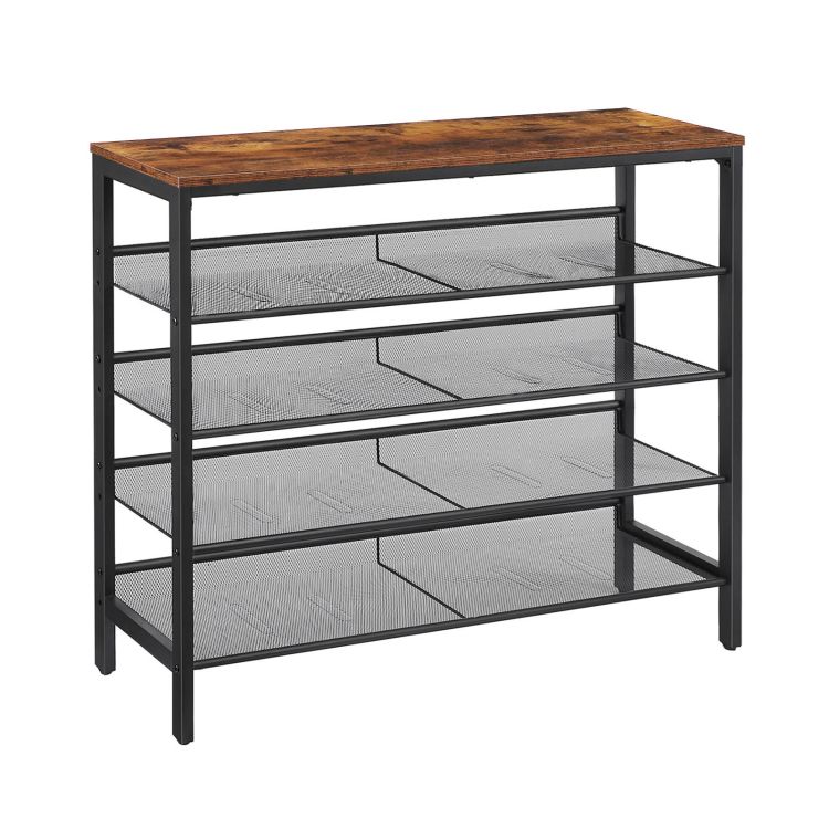 - enhanced durability: this shoe rack is built with particleboard in a rustic brown finish and heavy-duty powder coated iron frame as well dense mesh shelves, which ensures the stability and durability. the top plate loads up to 22 رطل (10 كلغ), and each mesh shelf loads up to 11 رطل (5 كلغ). while the smooth top surface provides an ideal platform for a charging station or a stylish lamp