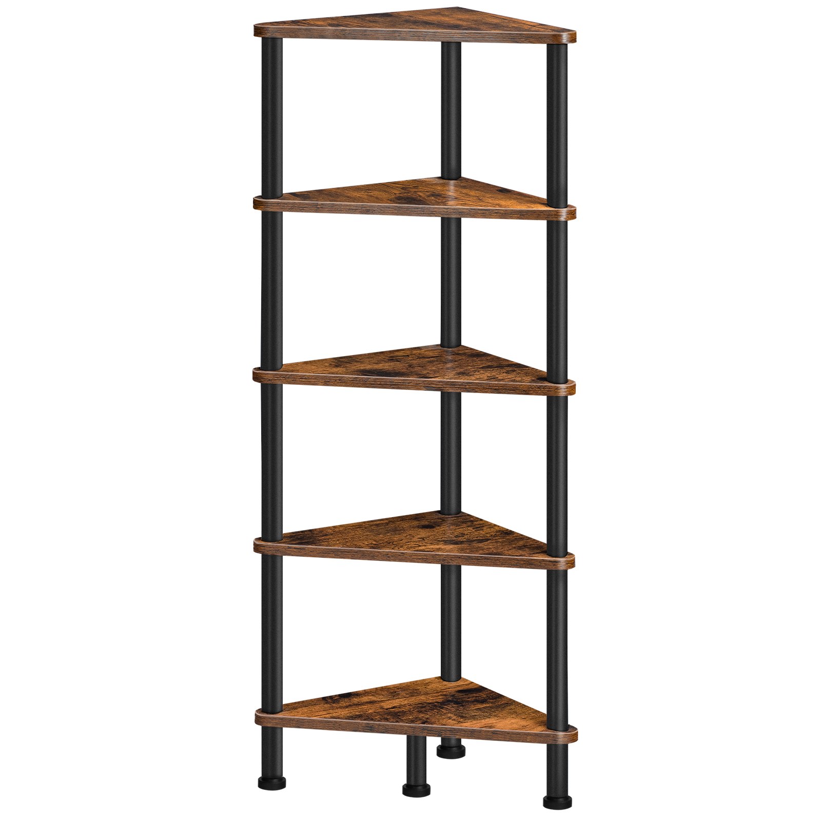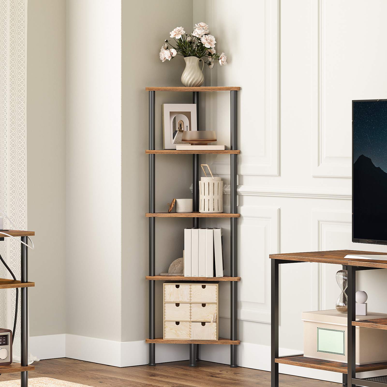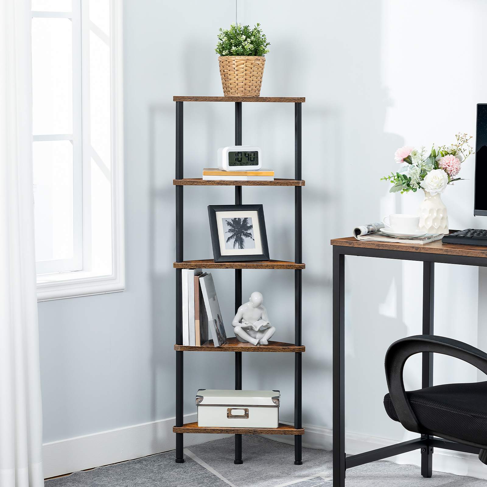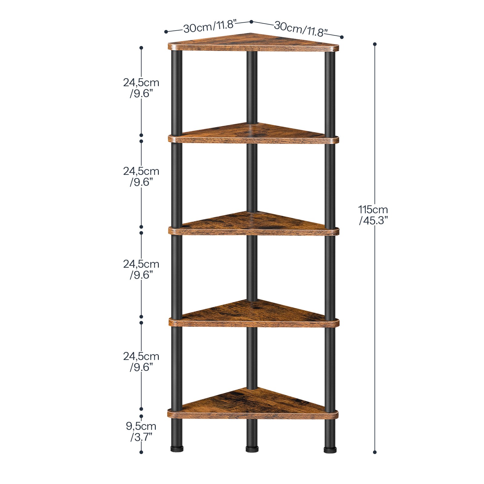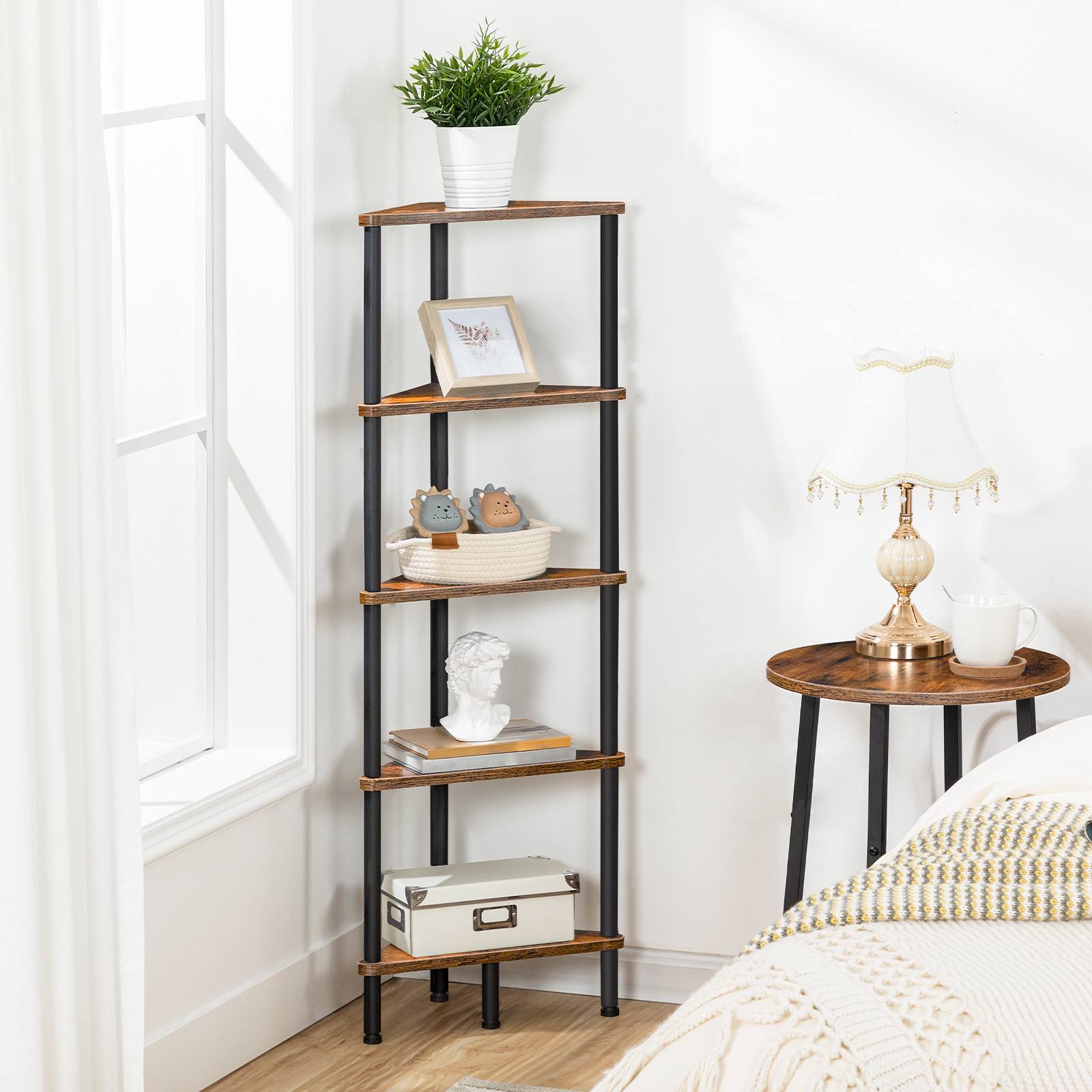 هيكل مستقر ودائم: The corner shelf is constructed of high-quality particleboard and a solid metal frame, ensuring excellent stability and long-term durability. The rustic brown shelves paired with black metal bars highlight its unique industrial charm, making full use of unused corner spaces for efficient utilization.