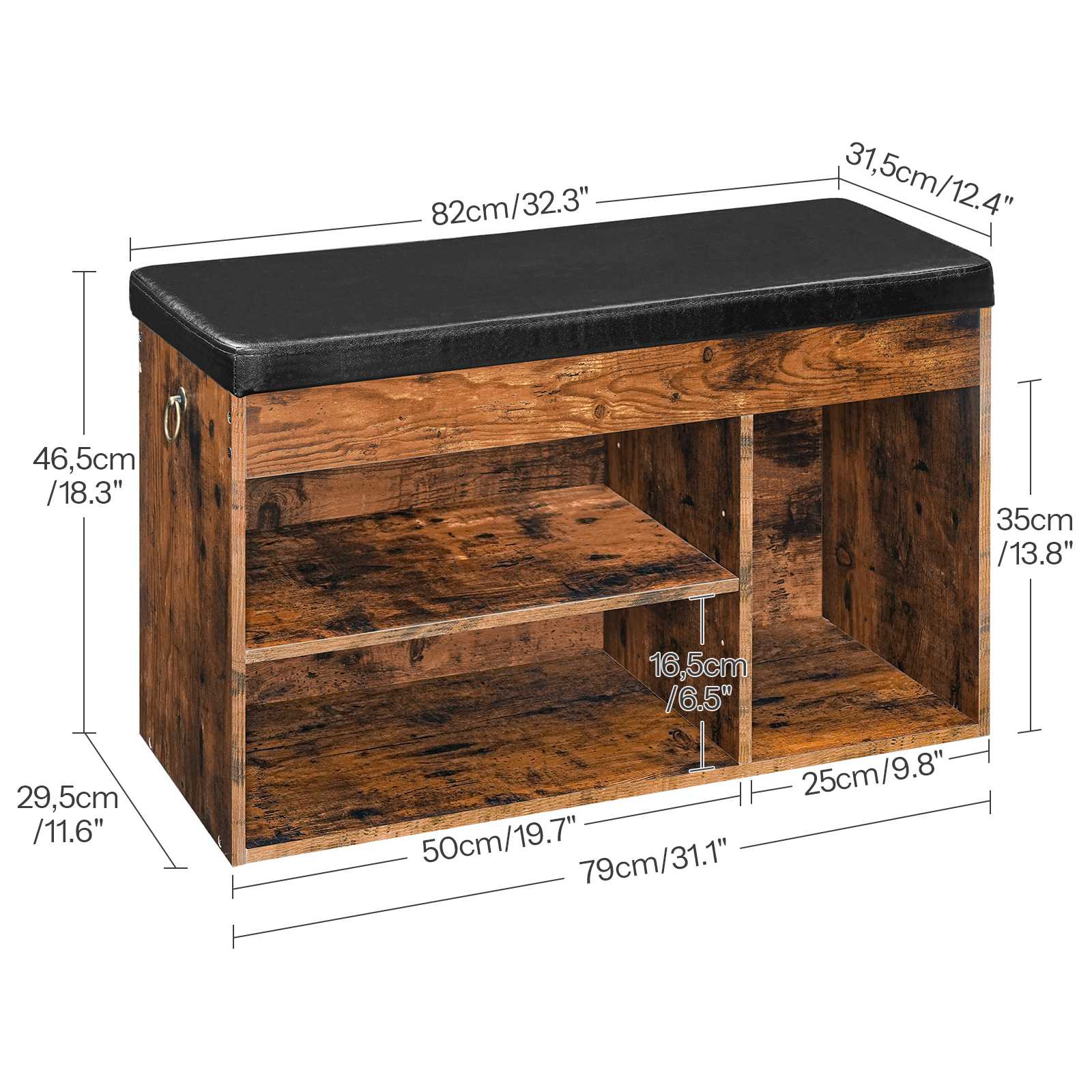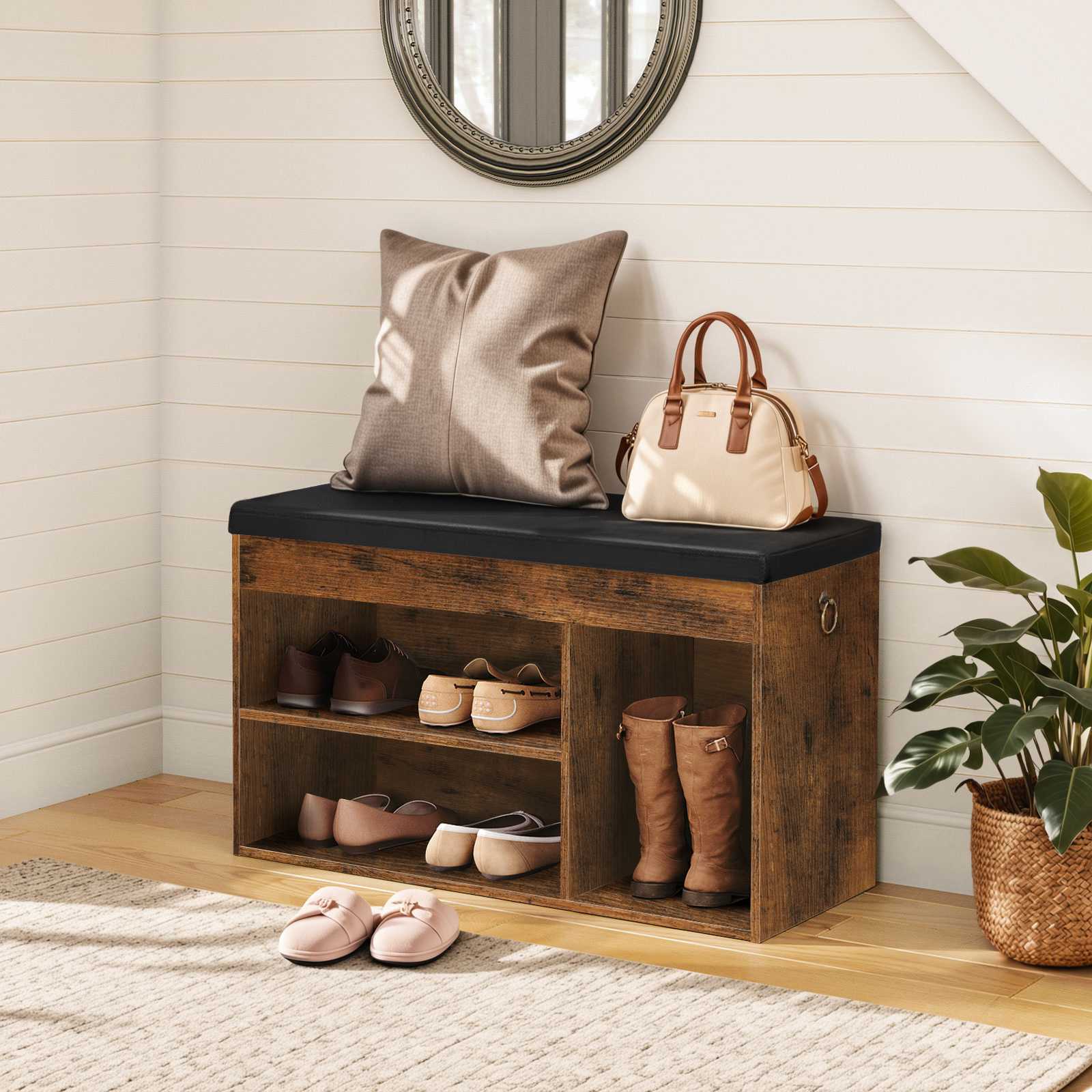 راحة عالية & مظهر أنيق: The seat cushion is made of soft leather, ensuring comfortable shoe-changing experiences. The shoe bench has a maximum load-bearing capacity of 99.8kg, with a black soft cushion and rustic brown panel frame, boasting a stylish design that complements various indoor decors.
