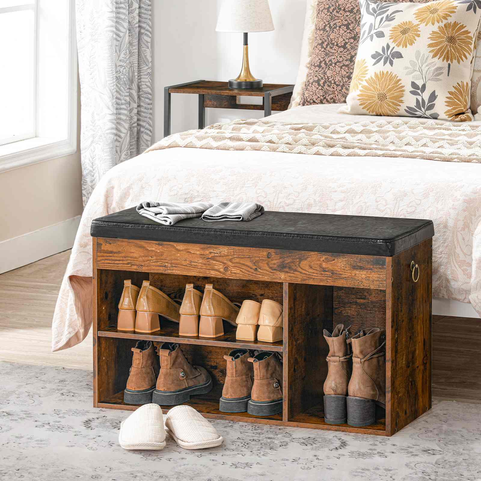 مقعد تخزين الأحذية باللون البني الريفي مع وسادة مبطنة, مقعد مدخل مع صندوق تخزين قابل للفتح ورف قابل للتعديل, رف الأحذية مع مقصورة مخفية, للدخول, غرفة الجلوس