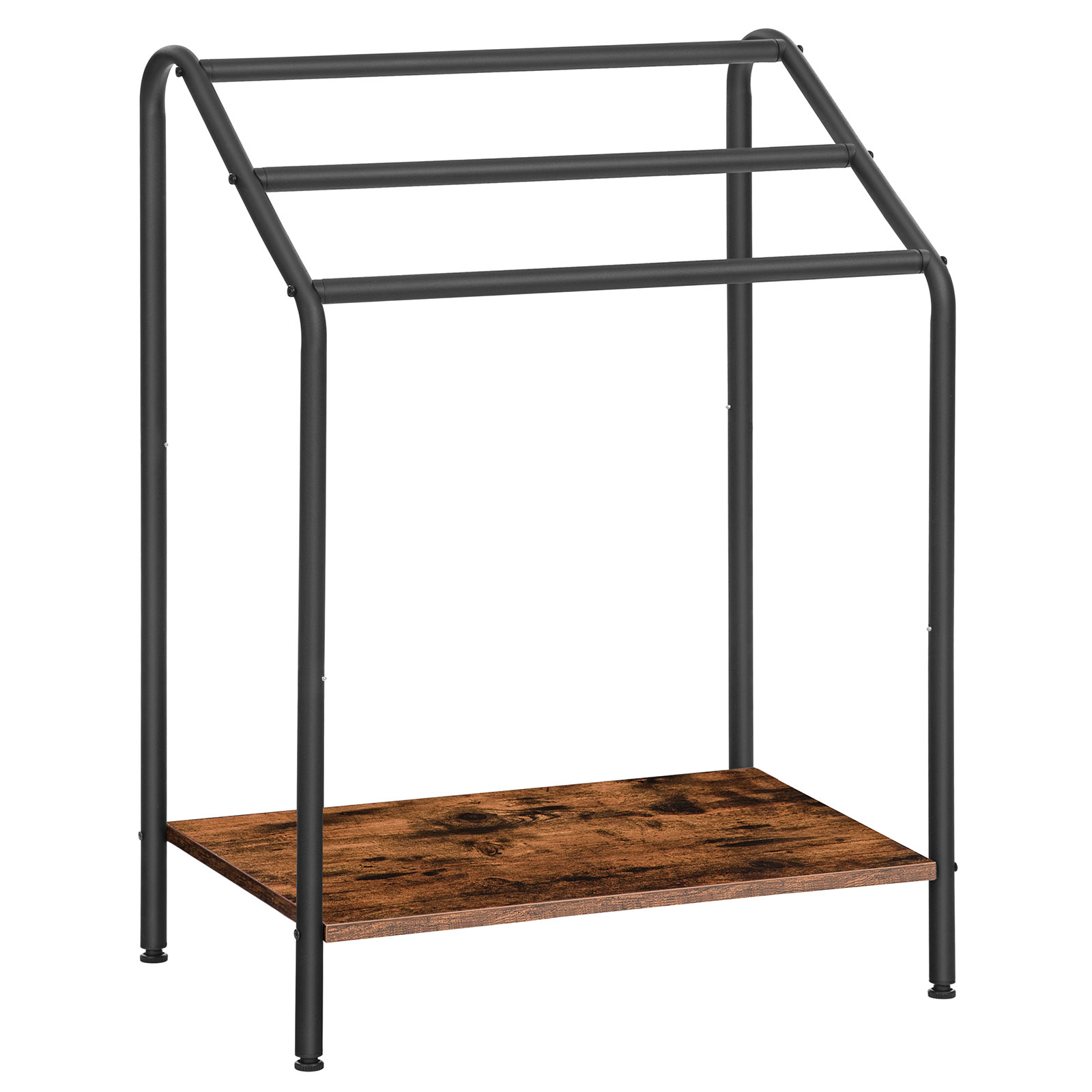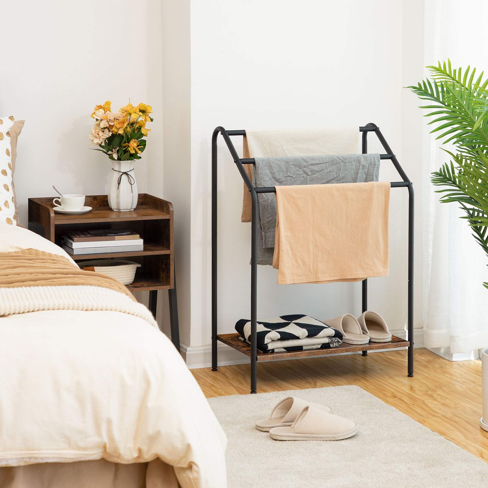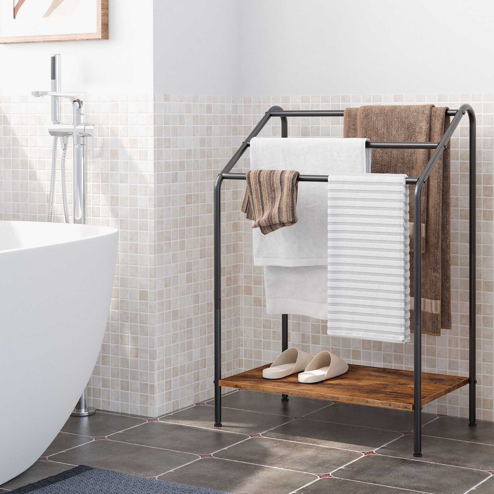حامل مناشف قائم بذاته مكون من 3 طبقات, ريفي براون & تجفيف متعدد الوظائف باللون الأسود & رف العرض, مناسبة للحمام, غرفة الجلوس, غرفة نوم