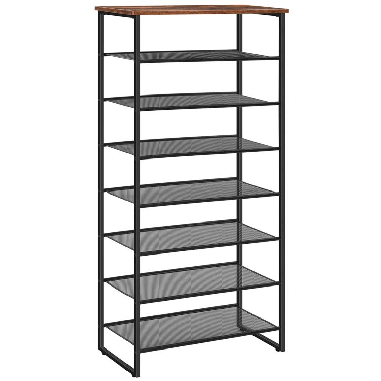 - sturdy storage rack: composed of beautifully engineered wooden surface shelves and sturdy metal frame, the well-built storage organizer with 7 black metal mesh shelves meets your storage needs, not just limited to the function of putting footwear