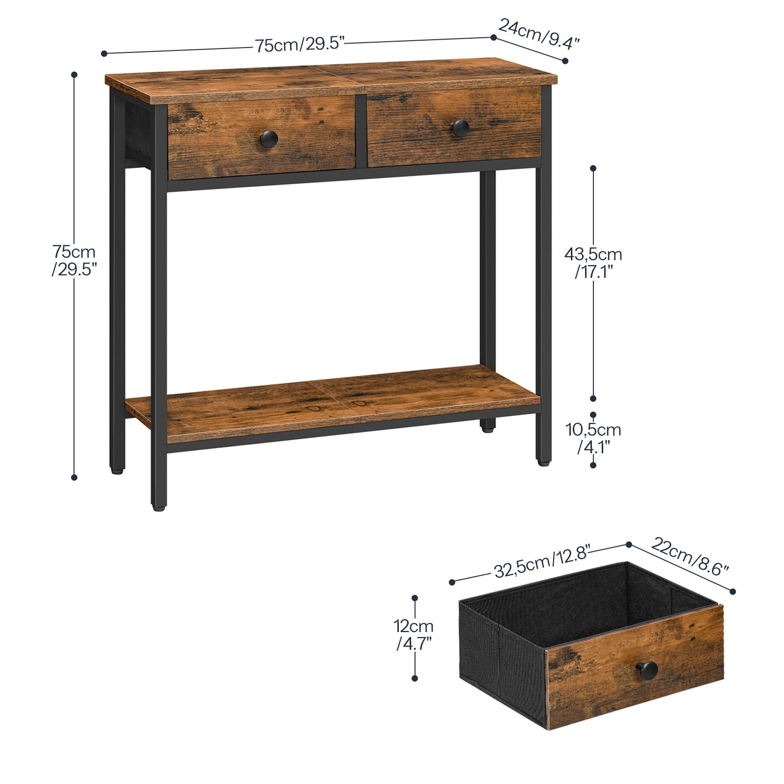 طاولة كونسول صناعية رفيعة مع 2 أدراج غير منسوجة, طاولة تخزين المدخل الضيق, مناسبة للمساحات الصغيرة وغرف المعيشة, ريفي براون & أسود