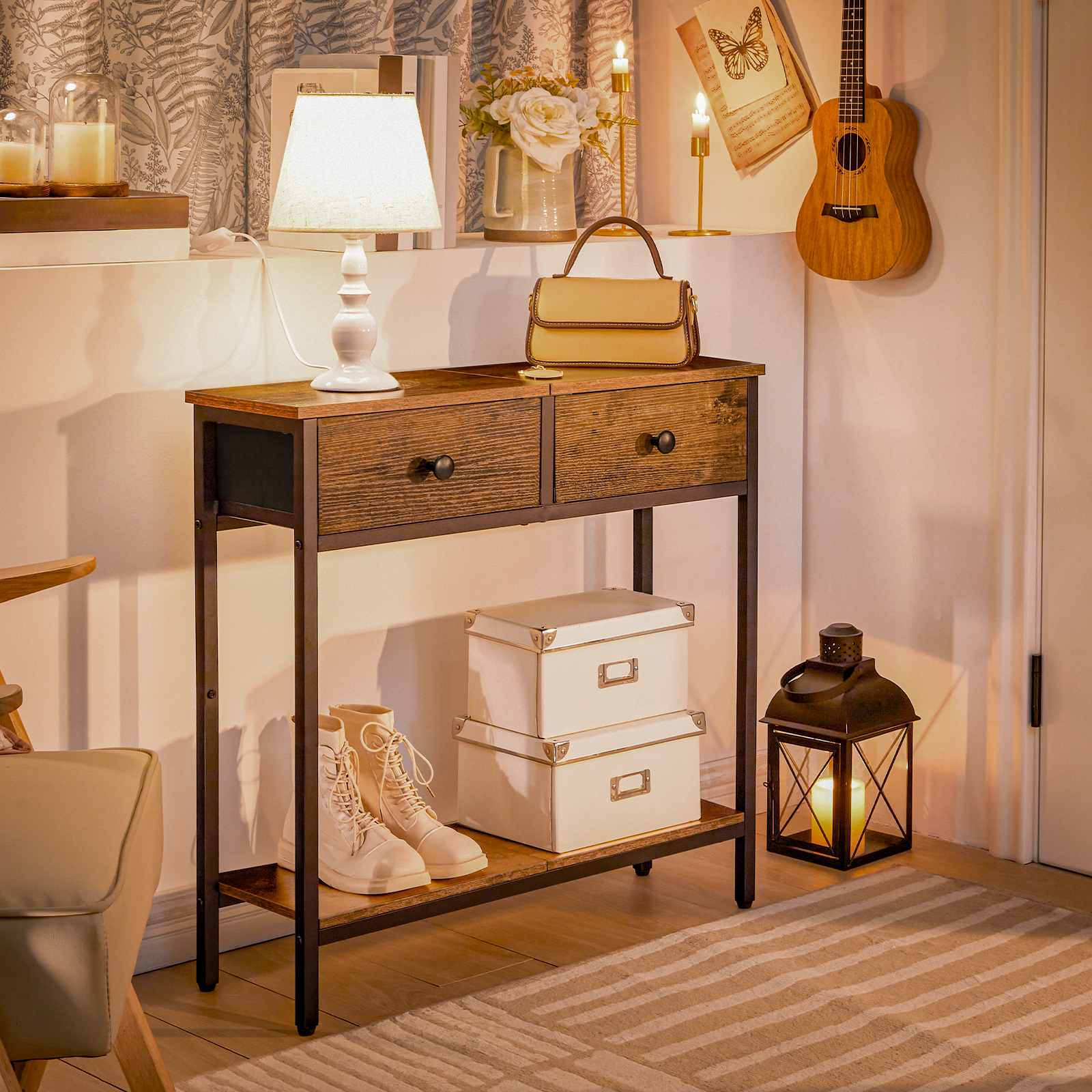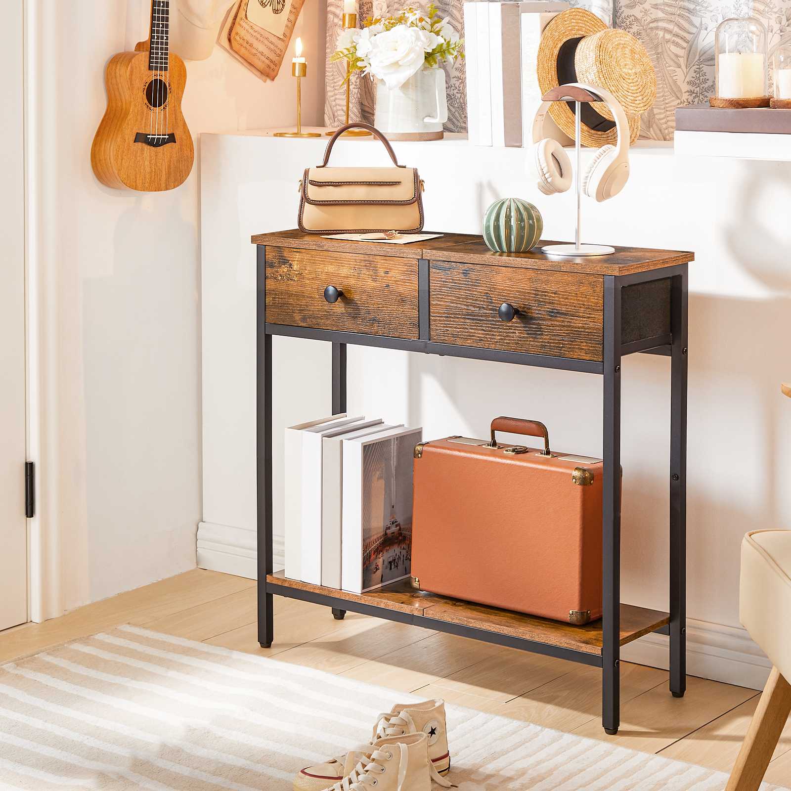 Flexible Storage Functionality: This slim console table is equipped with two non-woven drawers and two shelves, providing versatile storage solutions to meet diverse daily needs. The open space of the console table can be used for displaying decorative items such as photo albums, while the drawers are designed for storing keys, personal belongings and other small items.