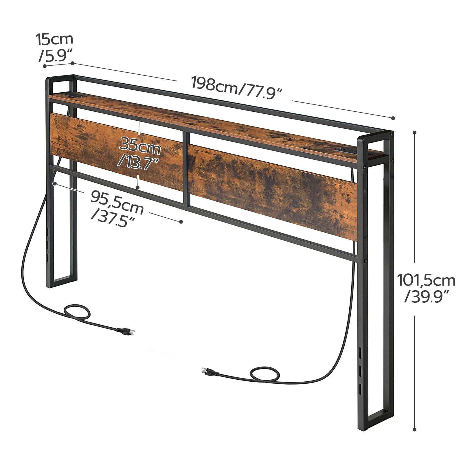 King Size Headboard with Power Outlets & منافذ يو اس بي, Height-Adjustable Design with Storage Rack, Sturdy Rustic Brown & Black Headboard, تجميع سهل