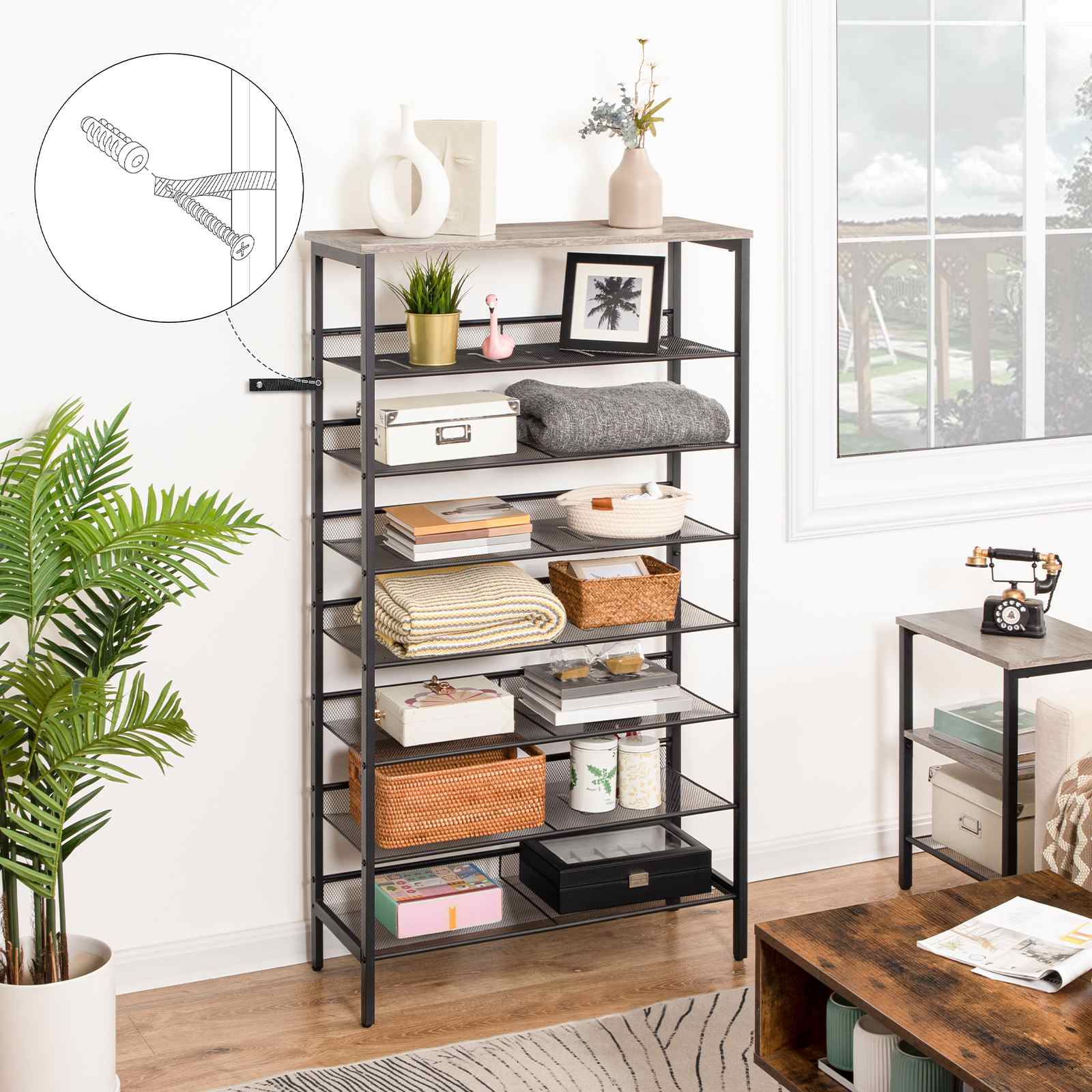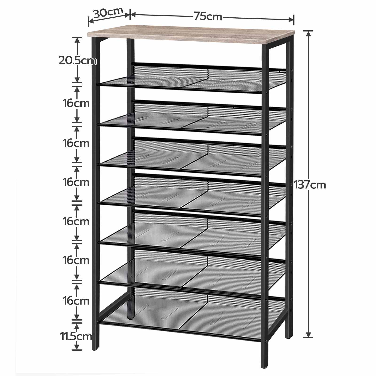 تصميم قابل للتعديل متعدد الاستخدامات: ال 7 يمكن تعديل الأرفف الشبكية على الأوضاع المسطحة أو المائلة حسب الحاجة لسهولة الوصول إليها. يمكن إزالة رف واحد لاستيعاب الأحذية, الكعب العالي والأحذية الكبيرة الأخرى.