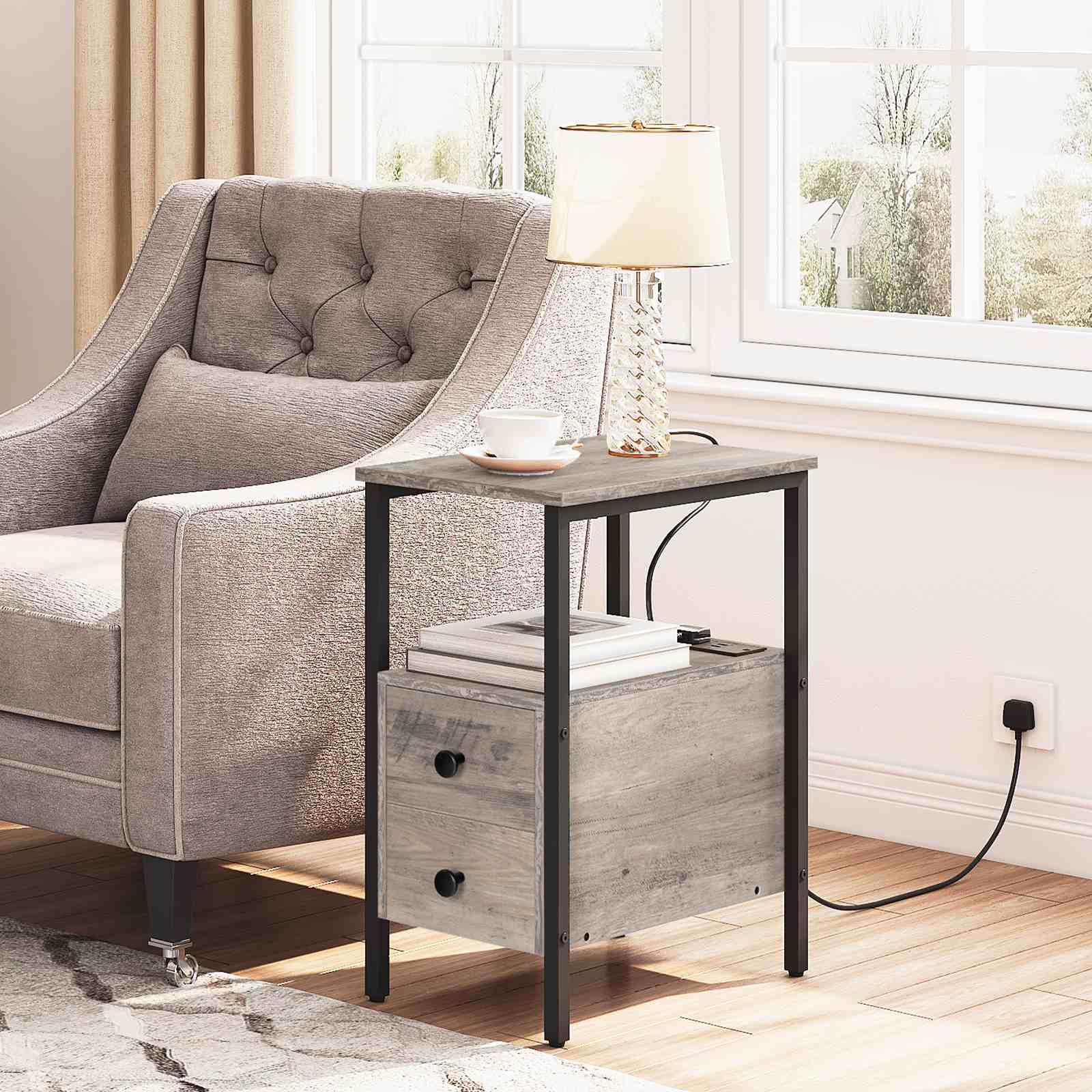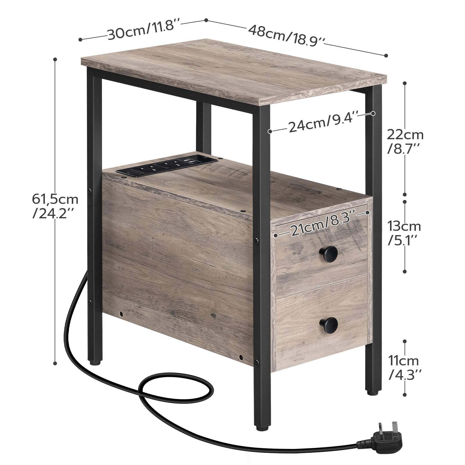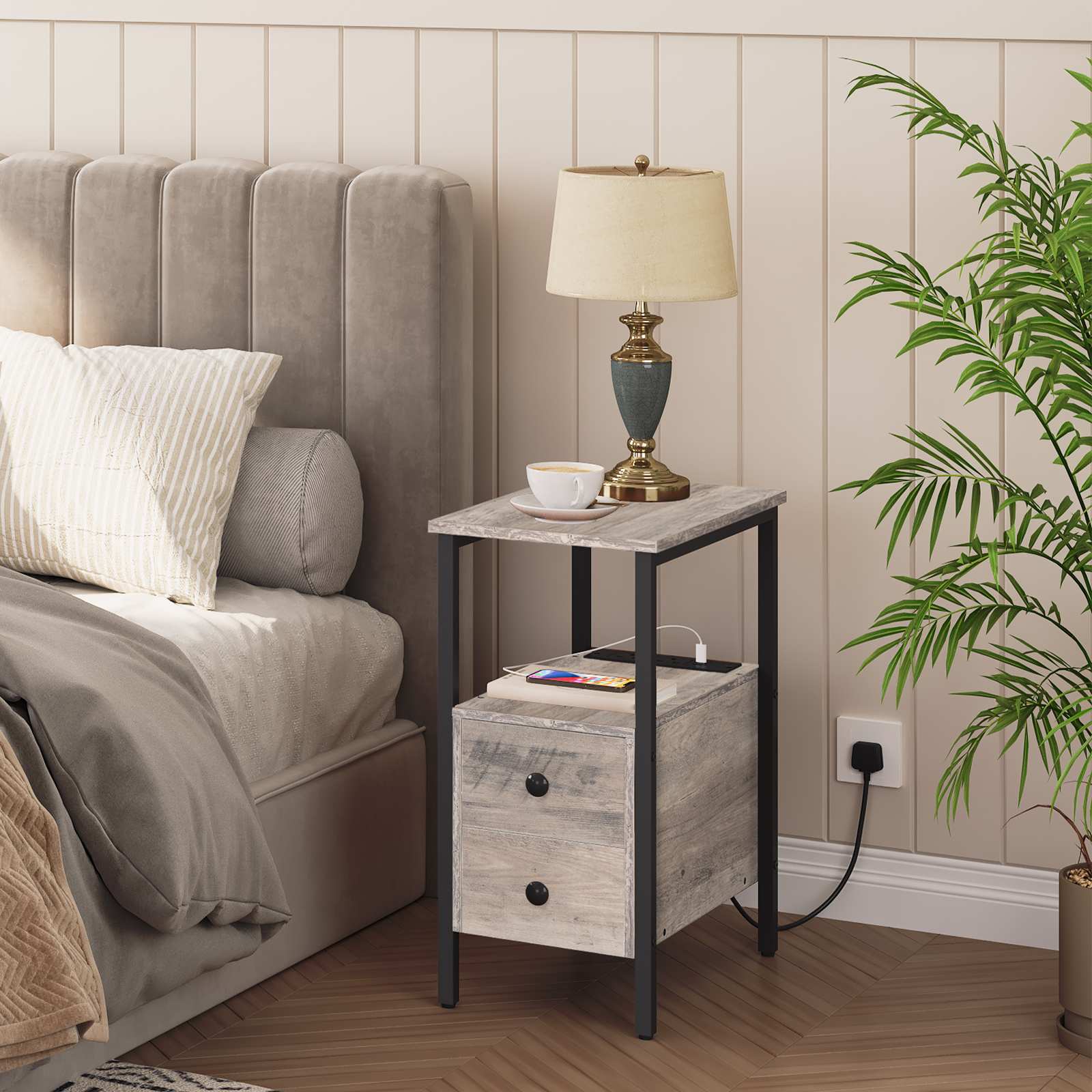 طاولة جانبية ضيقة مع محطة شحن, Equipped with USB Ports & منافذ الطاقة, Slim Space-Saving Side Table with 2 أدراج, Industrial Grey and Black Nightstand