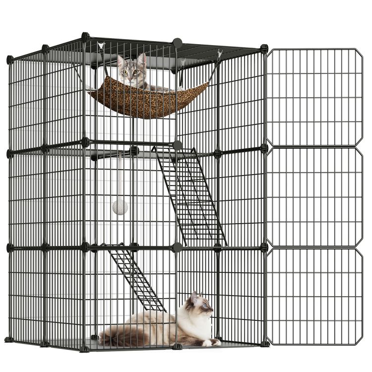 قفص كبير للقطط, 3-حاويات داخلية للقطط, بيت للقطط مصنوع من سلك معدني قابل للفصل مع أرجوحة وكرات معلقة, ل 1-2 القطط, سهولة التجميع, أسود