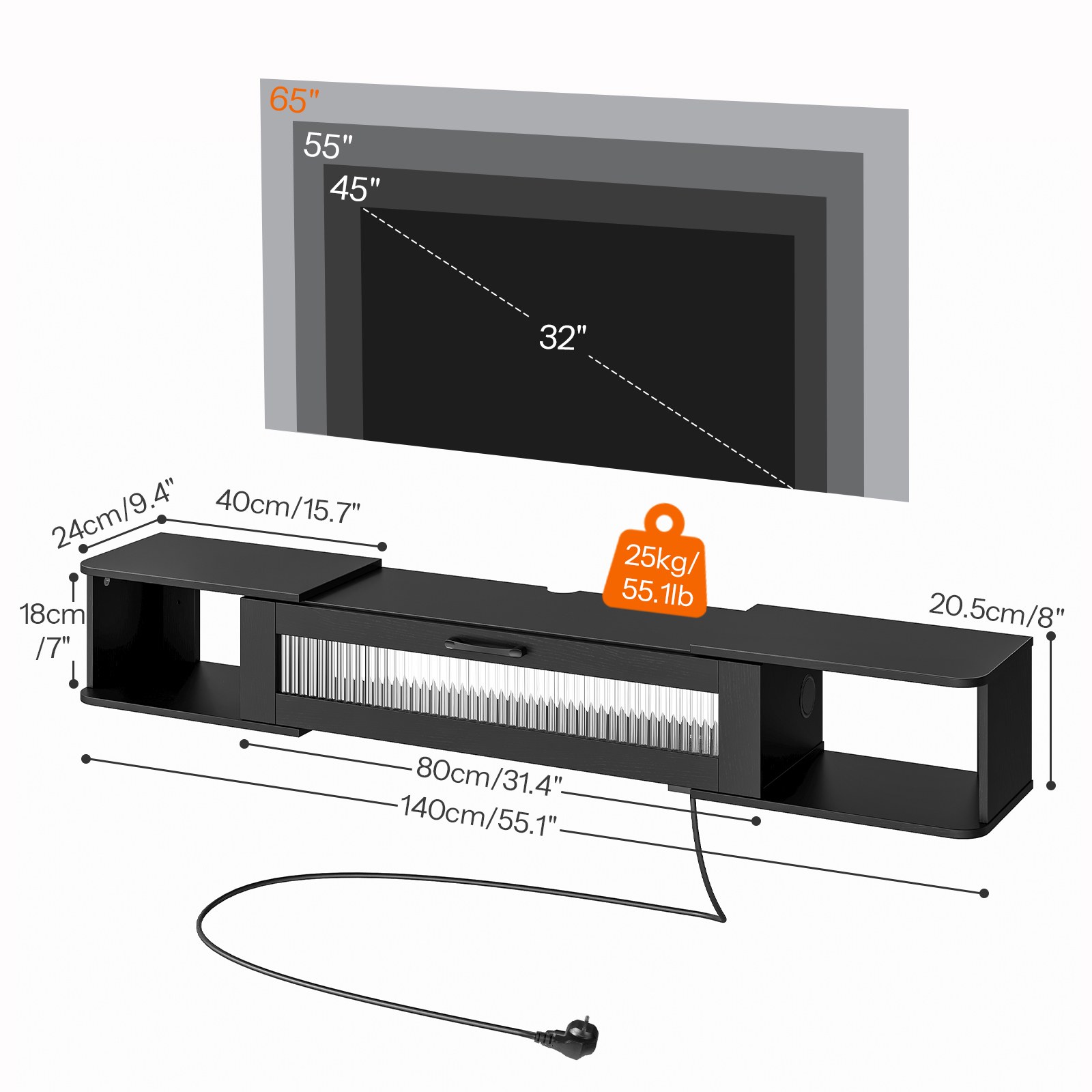 140خزانة تلفزيون عائمة مثبتة على الحائط مع محطة شحن, شريط LED ملون, 3 المنافذ القياسية و 2 منافذ يو اس بي, متوافق مع أجهزة التلفاز حتى 65 بوصة, أسود