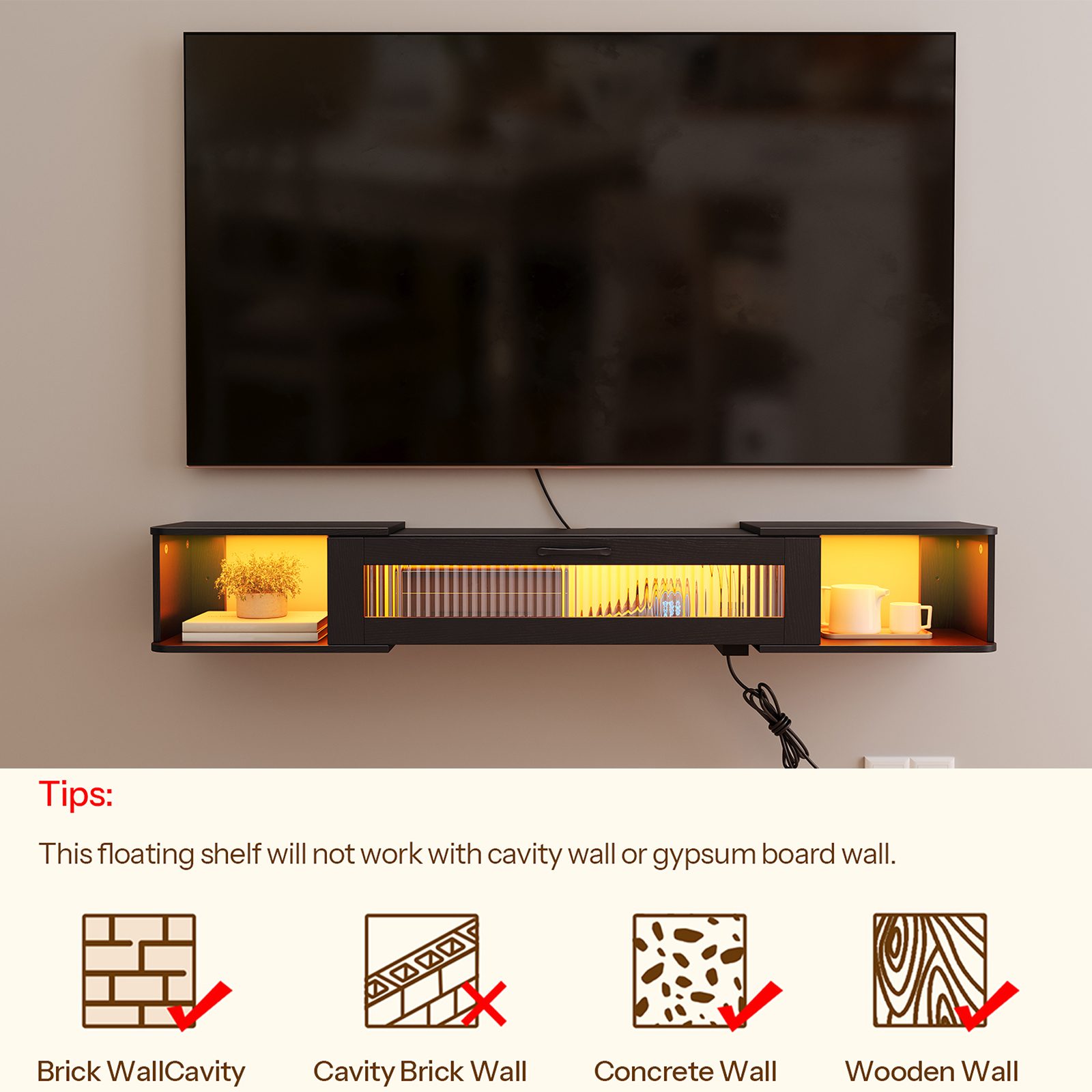 عملية التجميع المبسطة: مناسبة للخرسانة, wood and brick walls, the floating TV cabinet comes with complete hardware and clear illustrated instructions. The streamlined assembly design ensures convenience and efficiency, allowing users to quickly complete installation and enjoy their TV viewing experience.