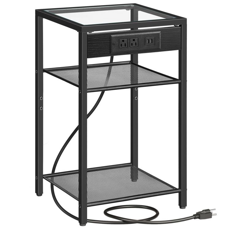 طاولة لهجة قمة زجاجية مع محطة الشحن, 3-طبقة ضئيلة منضدة مع أرفف التخزين, الجدول النهائي مع منافذ USB & منافذ الطاقة, زجاج صلب, أسلوب حديث, لغرفة المعيشة, غرفة نوم, أسود
