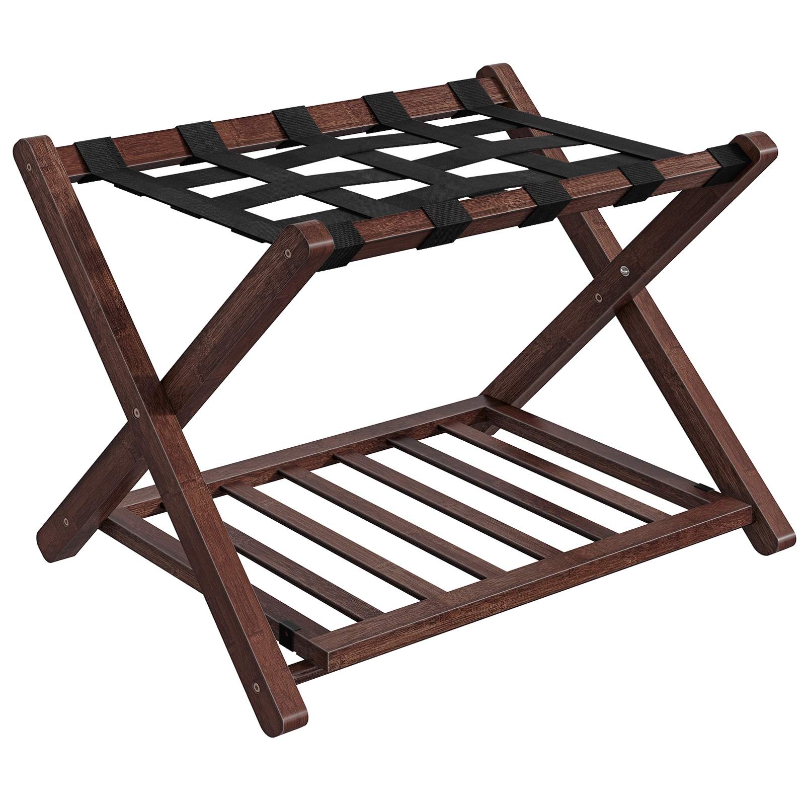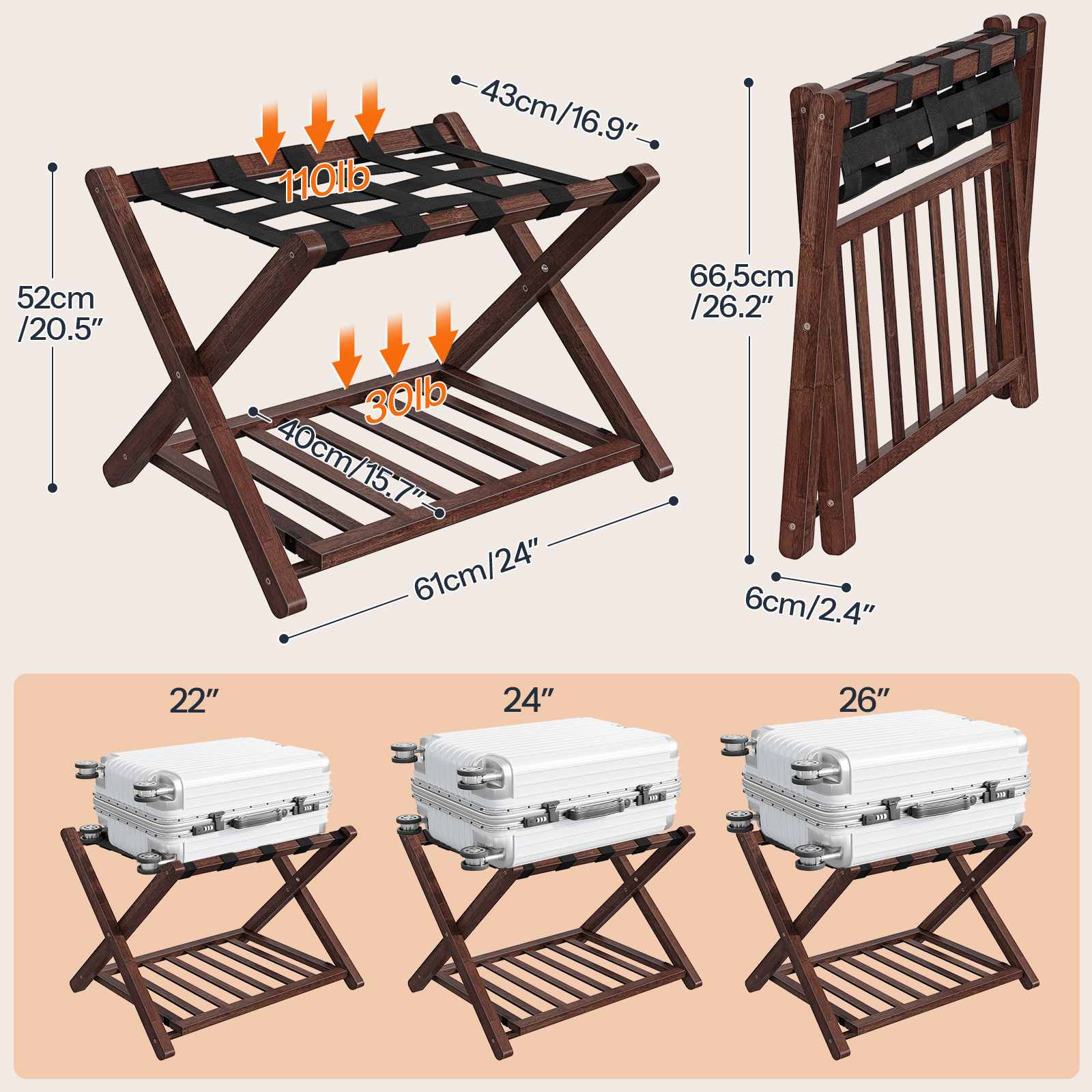 رف أمتعة من الخيزران قابل للطي مع رف تخزين مزدوج الطبقة, دعم حزام النايلون, 110 سعة تحميل رطل, يناسب حقائب السفر مقاس 26 بوصة, للفندق & غرفة نوم, بني