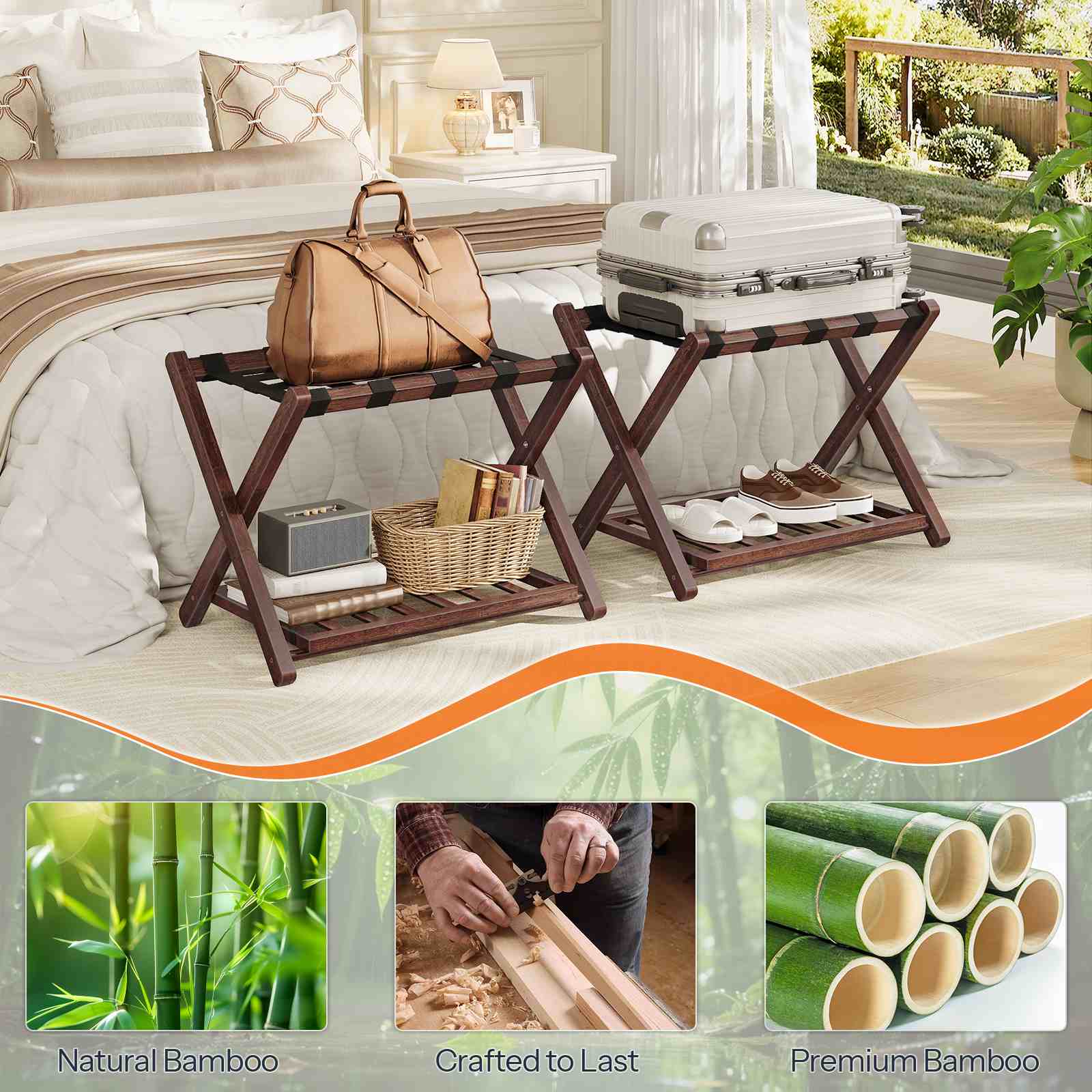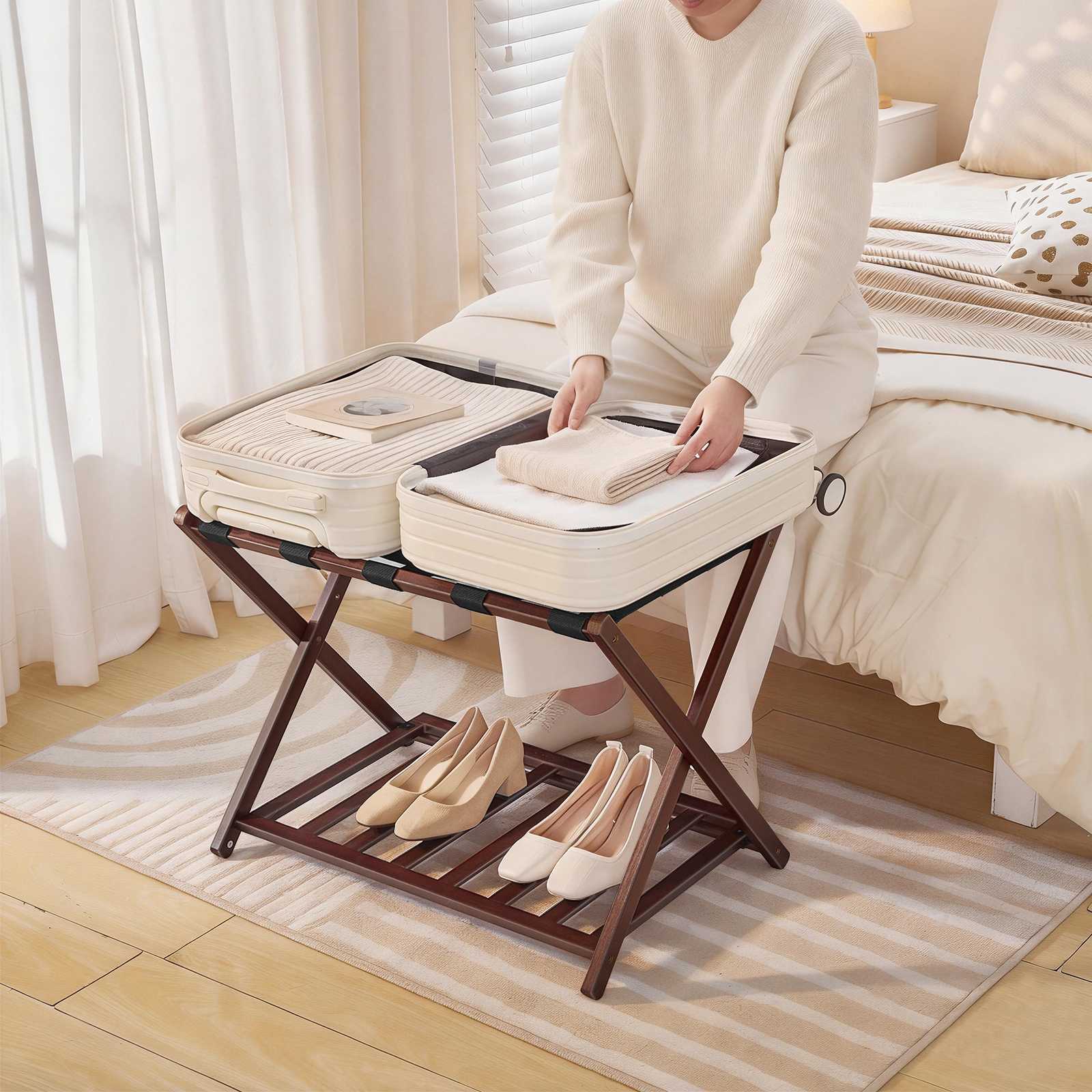 Premium Bamboo Construction: Crafted from high-quality bamboo with a smooth finish, the rack offers exceptional durability and ease of maintenance. Its X-shaped frame structure enhances structural stability, supporting a maximum load capacity of 110 lb and maintaining steadiness even when holding two suitcases simultaneously.