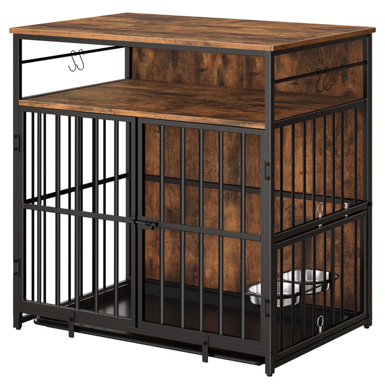 أثاث قفص الكلاب مع التخزين, 31.5" بيت الكلب الثقيل مع الأوعية & صينية قابلة للإزالة, طاولة نهاية قفص الكلب الخشبي للكلاب الصغيرة/المتوسطة, مقاومة مضغ, rustic brown dchr10801