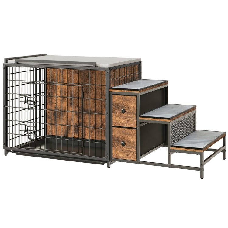 أثاث قفص الكلب, 53.1" بيت الكلب الخشبي مع أدراج التخزين ودرج السحب, جثم نافذة الكلاب مع الخطوات والسرير, قفص الكلب الثقيل للكلاب الصغيرة/المتوسطة, بني ريفي