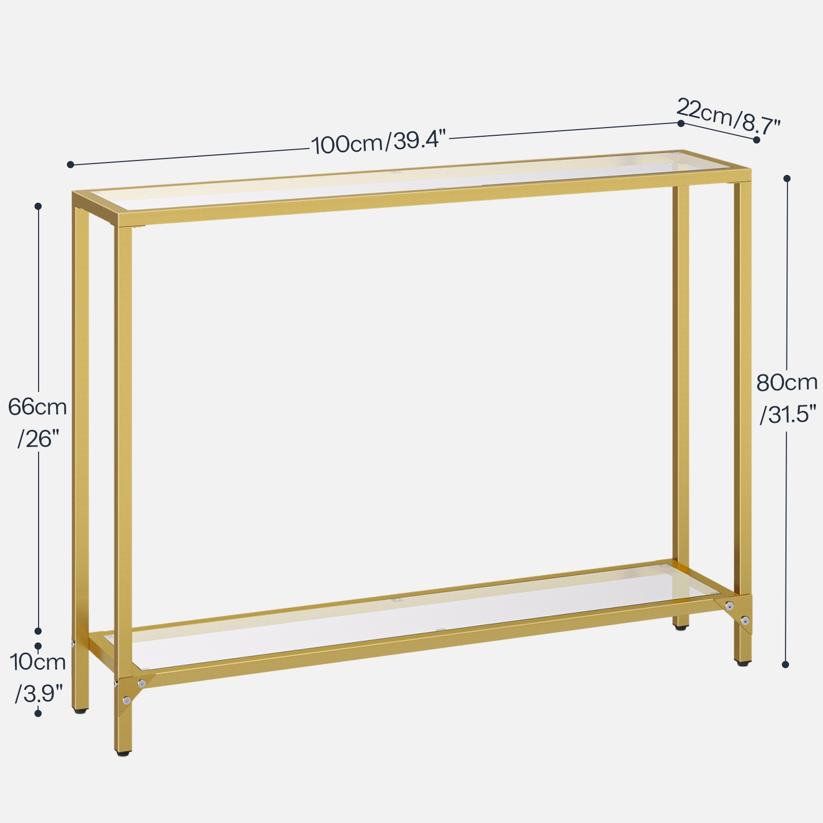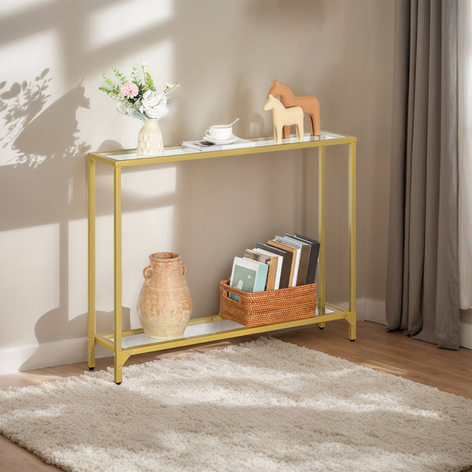 2-طاولة كونسول من الزجاج المقسى, طاولة أريكة للمدخل ذهبية رفيعة مع أرفف تخزين مزدوجة, منظم العرض الحديث لغرفة المعيشة, مناسبة للمساحات الصغيرة