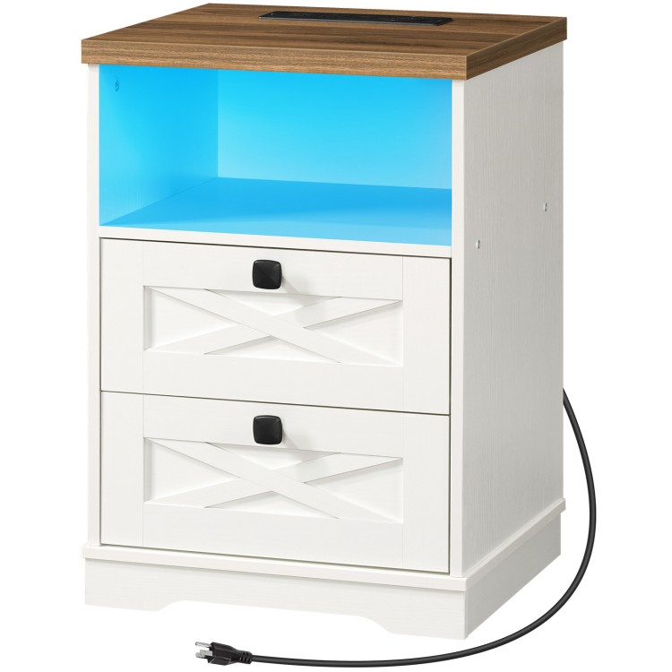 منضدة مع محطة الشحن اللاسلكية وأضواء LED, طاولة نهاية المزرعة مع 2 الأدراج والجرف المفتوح, طاولة جانبية LED ذكية مع اتصال لاسلكي وUSB لغرفة النوم, أبيض عتيق
