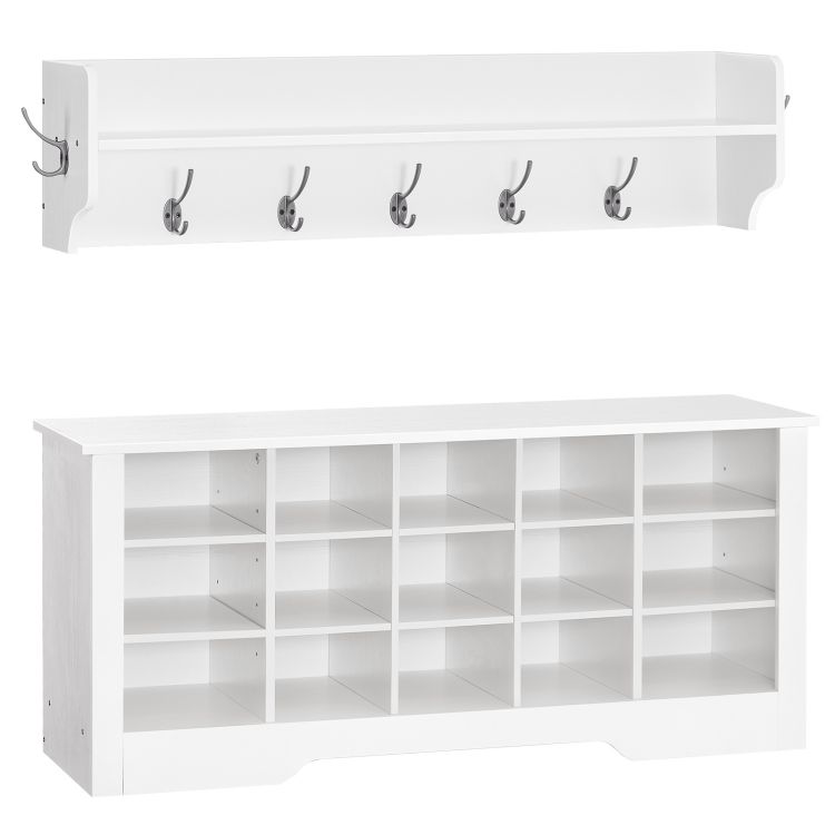 شجرة القاعة مع مقعد الأحذية, مجموعة مقعد الحذاء مع المعطف, 39.4 بوصة مدخل مقعد مع رف معطف, تنظيم غرفة الطين ومقعد التخزين, 15 Cubbies, رفوف قابلة للتعديل, الأبيض wt15mt01