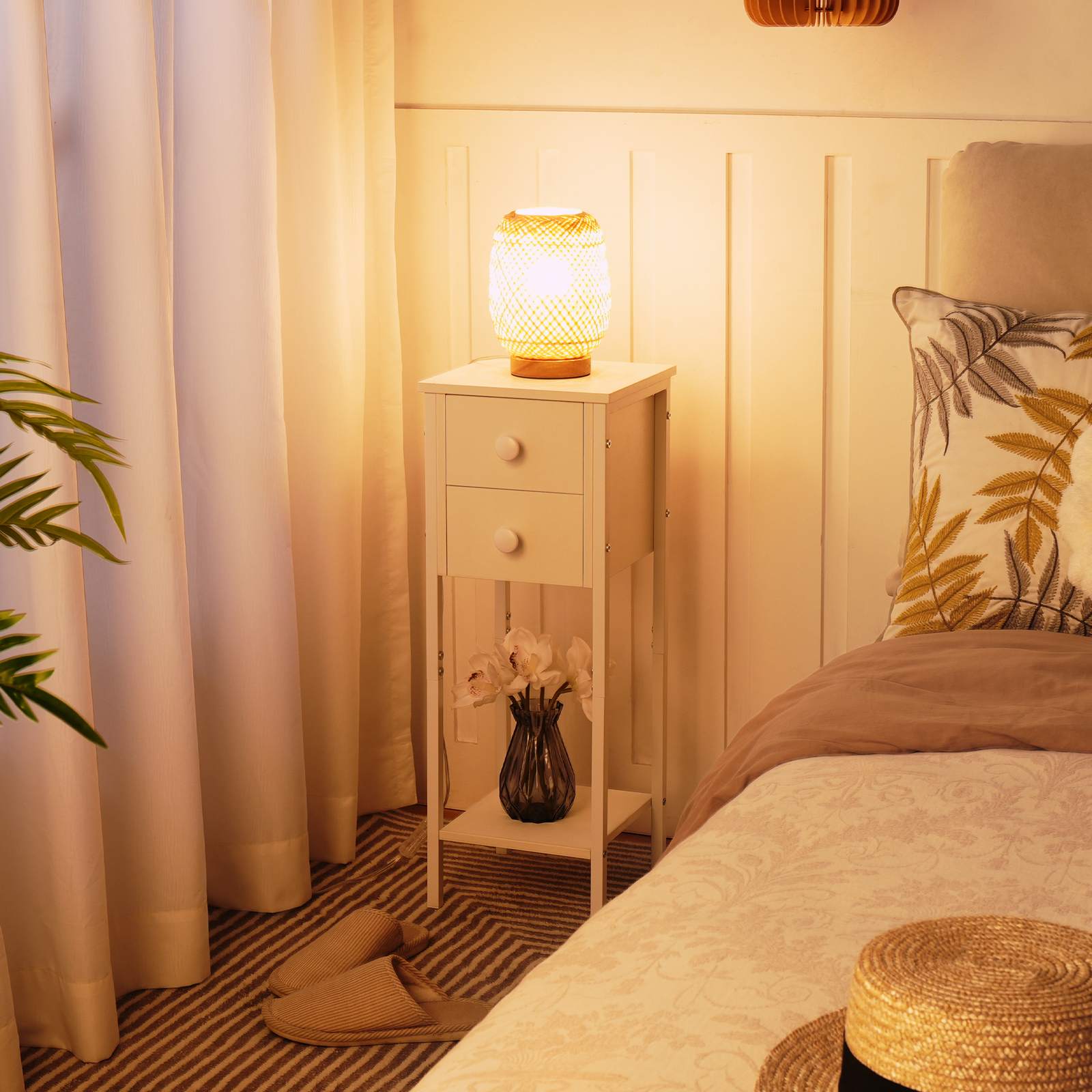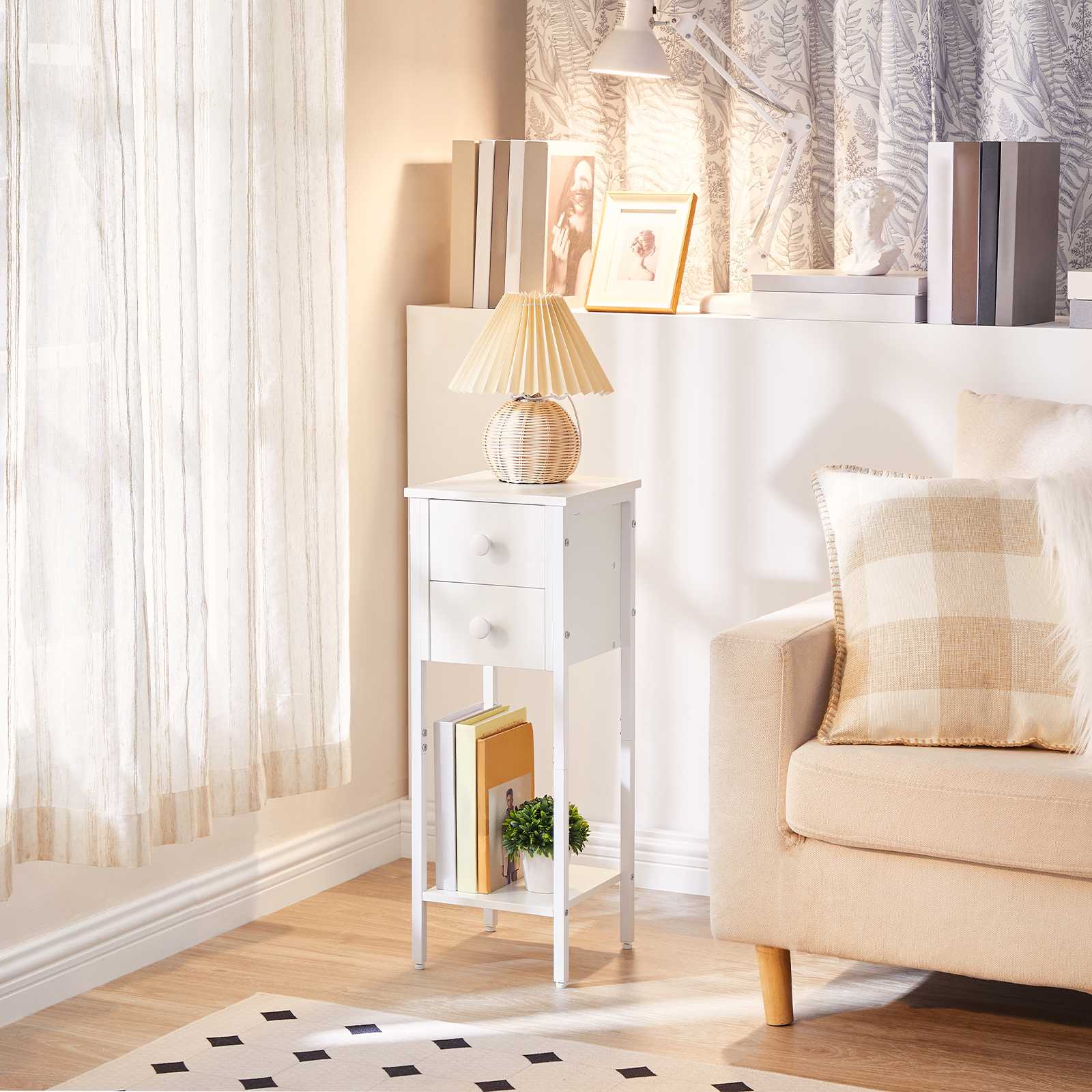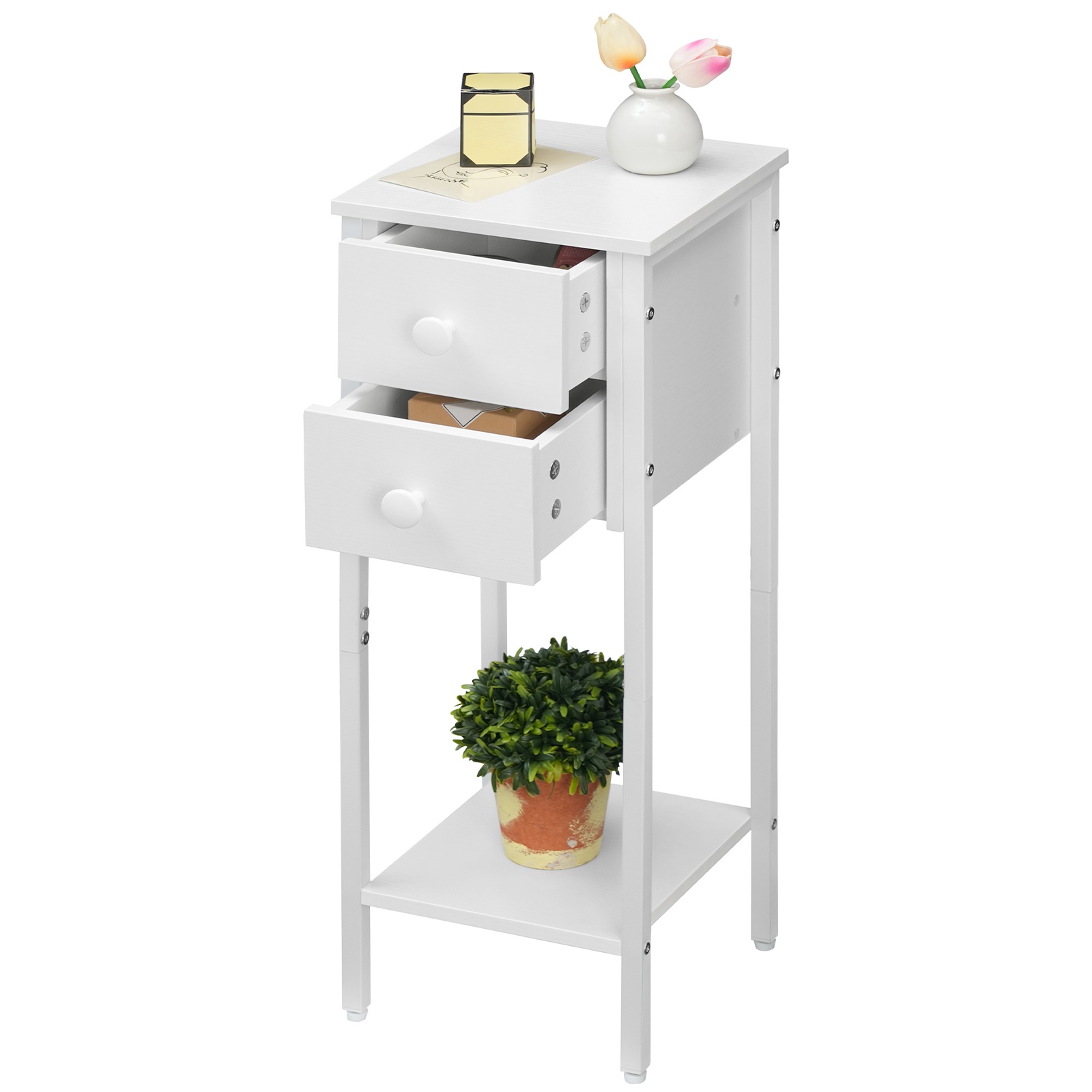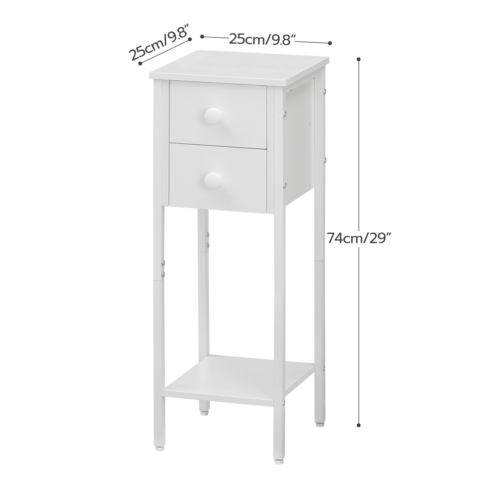 طاولة السرير البيضاء هذه مثالية للمساحات المحدودة. ال 25 س 25 سم (ل x ث) يمكن استخدام سطح الطاولة لعرض المزهرية الخاصة بك, مصباح الطاولة, النباتات الداخلية, إلخ., ال 2 أدراج لتخزين النظارات, مفاتيح, شواحن, وغيرها من الأغراض الشخصية والرف السفلي لوضع الكتب, المجلات, وسلال التخزين.