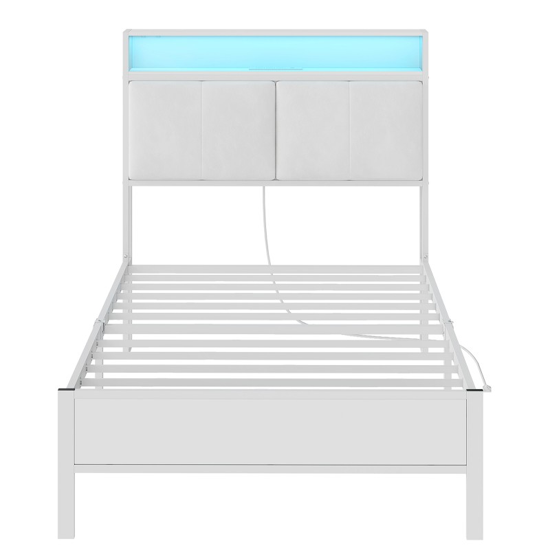 إطار السرير المزدوج الأبيض مع اللوح الأمامي المنجد, إطار سرير منصة معدنية مع اللوح الأمامي للتخزين, هيكل سرير مع محطة شحن وإضاءة LED