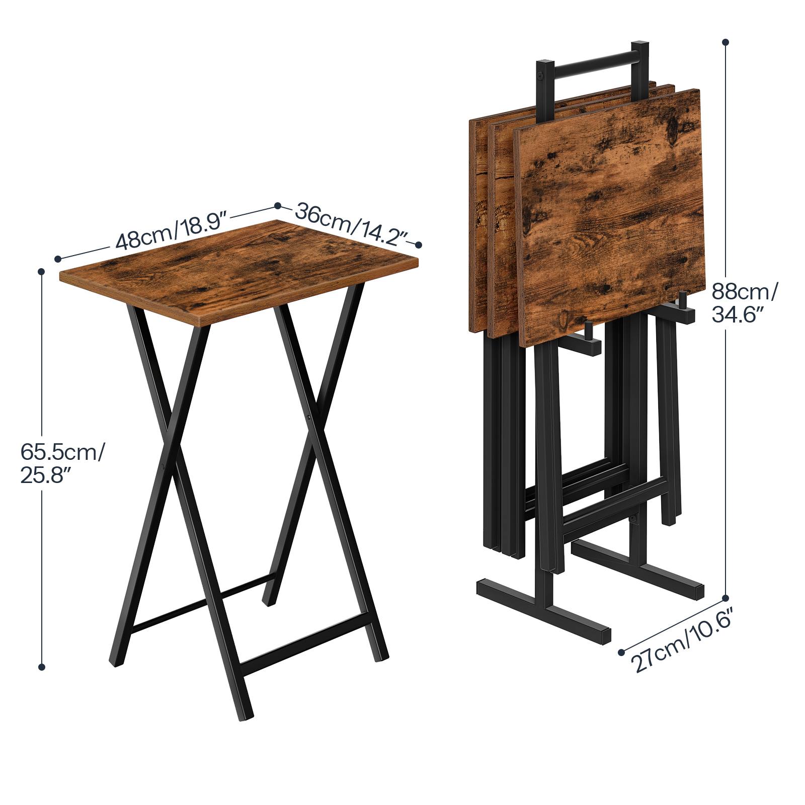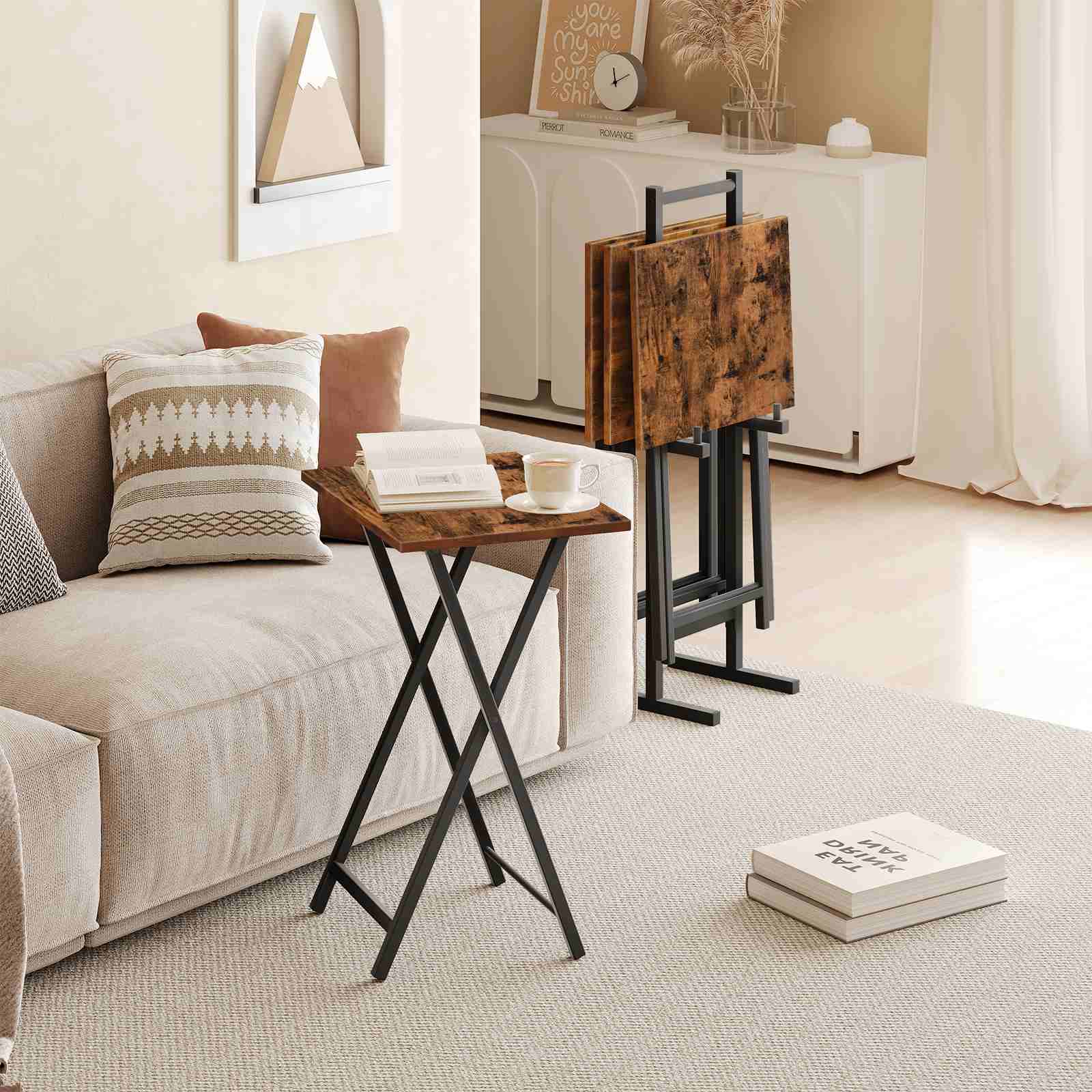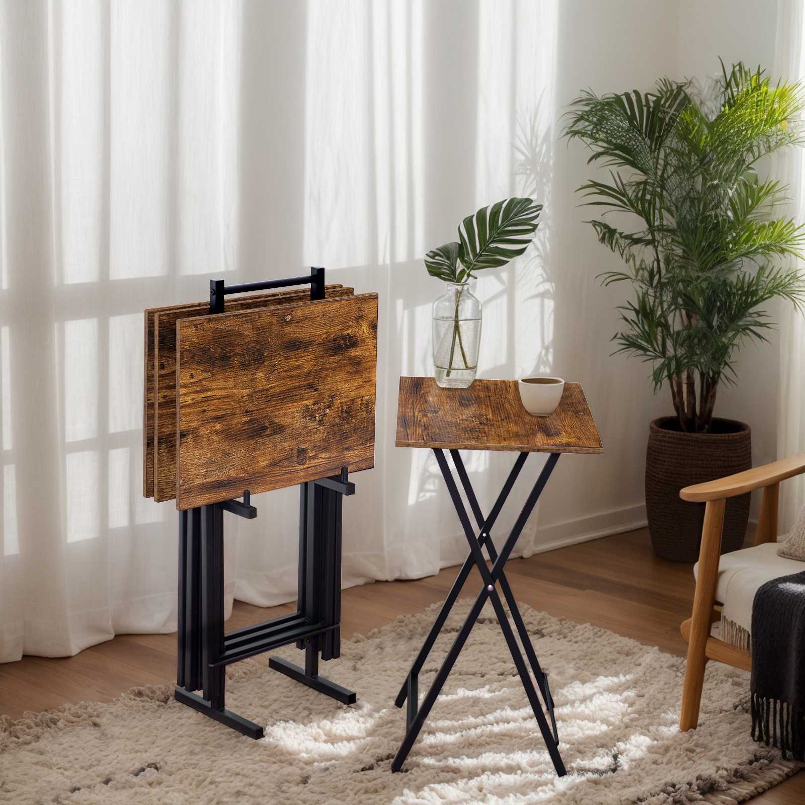 Skládací TV stolky (Sada 4) s úložným stojanem, Odkládací stolky v průmyslovém stylu, Skládací stolky na občerstvení pro malé prostory, Snadná montáž, Rustikální hnědá & Černý