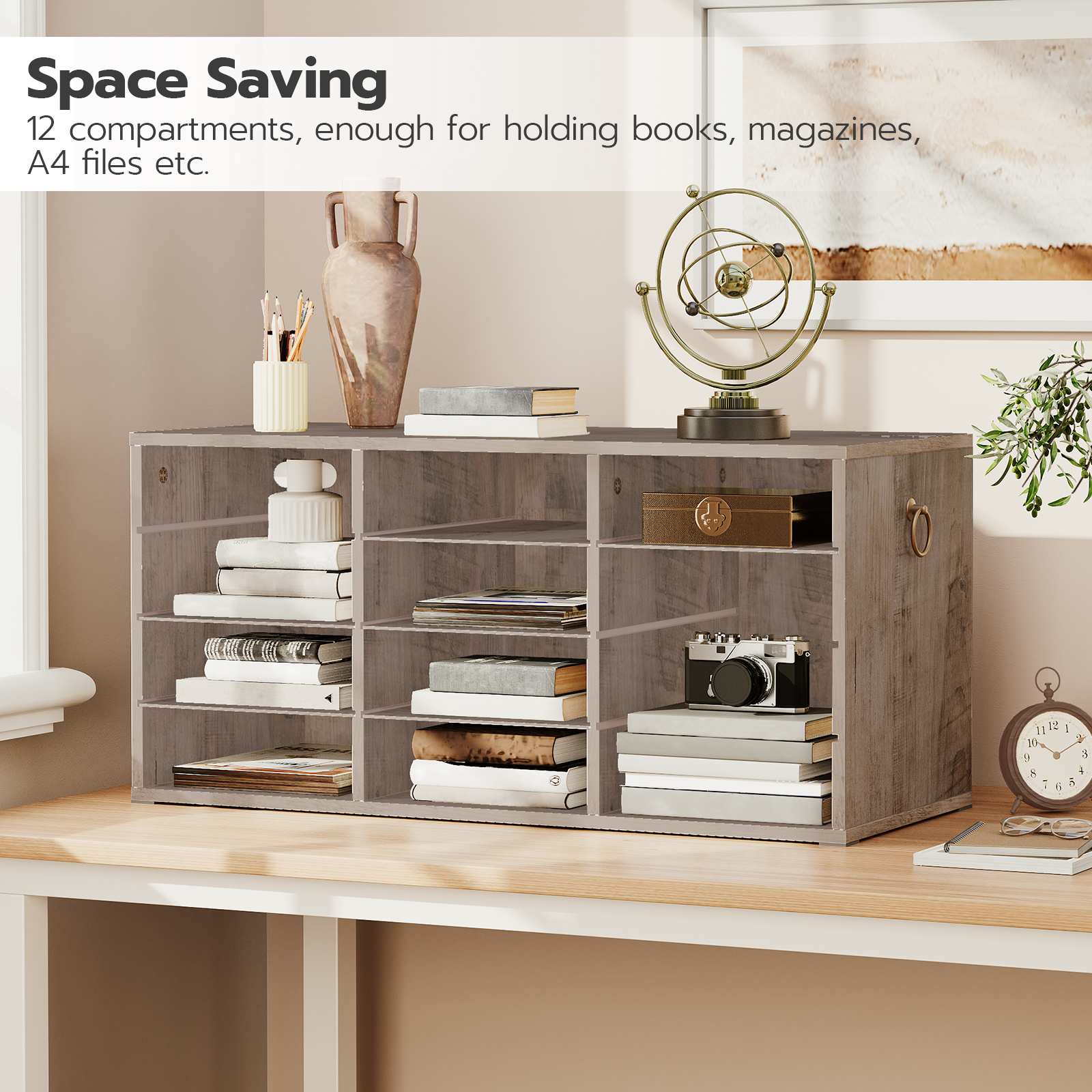 Vinobraní & Všestranná aplikace: With a greige finish and streamlined structure, this storage shelf is suitable for document classification in offices, study rooms and classrooms. It can also be adorned with decorative items on the top, zvýšení estetického vzhledu prostoru.