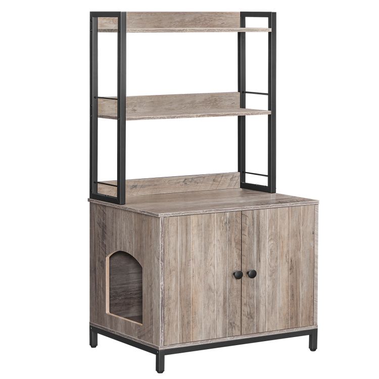 Šedá a černá krabička na odpadky s policemi, Dřevěný kočičí krabicový nábytek, Velký skrytý nábytek na odpadky dvojité dveře, Úložná skříň, pro většinu krabice na odpadky