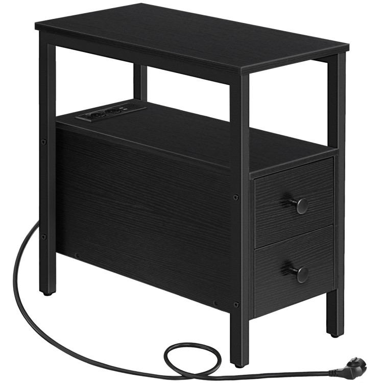 Odkládací stolek s nabíjecí stanicí, SOUFA TABLE s 2 Zásuvky a port a zásuvka USB, Noční stolek do malých prostor, Stabilní a robustní, pro obývací pokoj, Ložnice, Černý