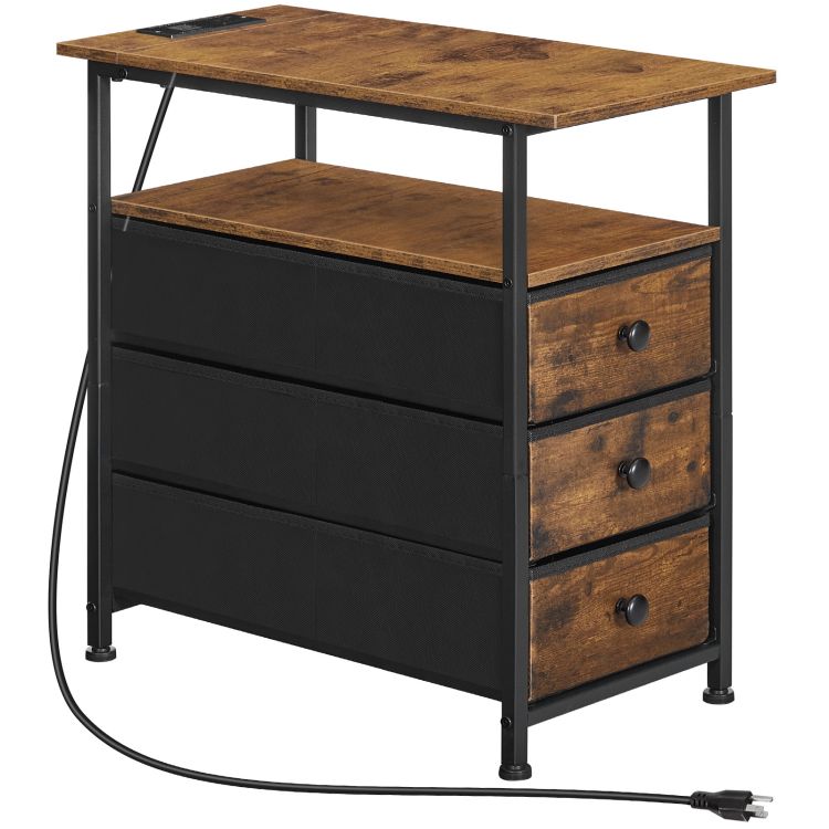Sluttabel, Smalt sidebord med opladningsstation, Natbord med 3 Ikke-vævede stofskuffer, Sengebord til små rum, til stuen, Soveværelse, Rustik brun og sort BF483UBZ01
