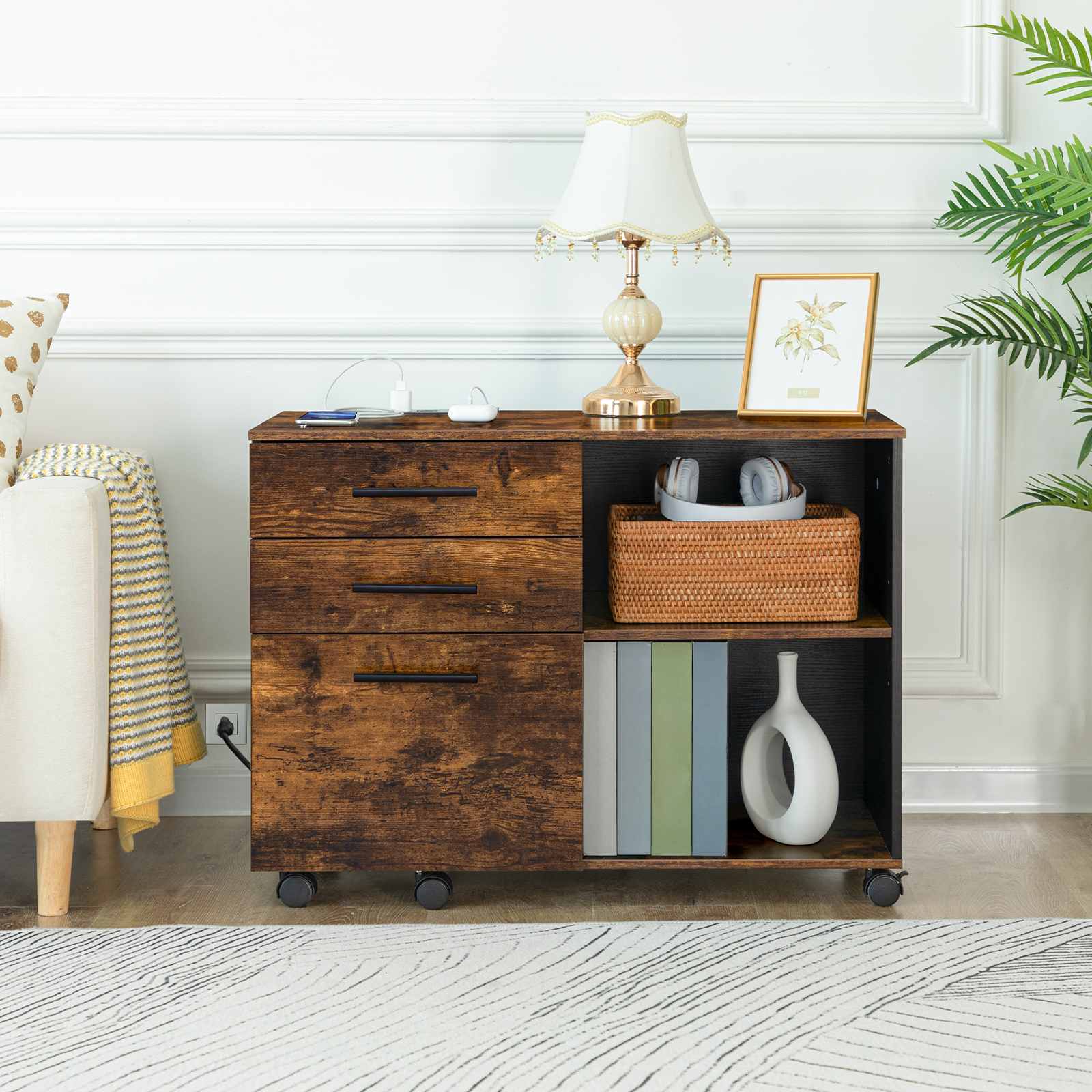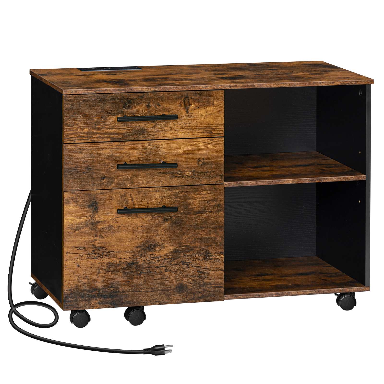 Lateralt arkiveringsskab med opladningsstation, 3-Skuffe kontoropbevaringsskab med USB-porte & Strømudtag, Printerstander med justerbar hylde til A4/Letter-filer, Brug af hjemmekontor