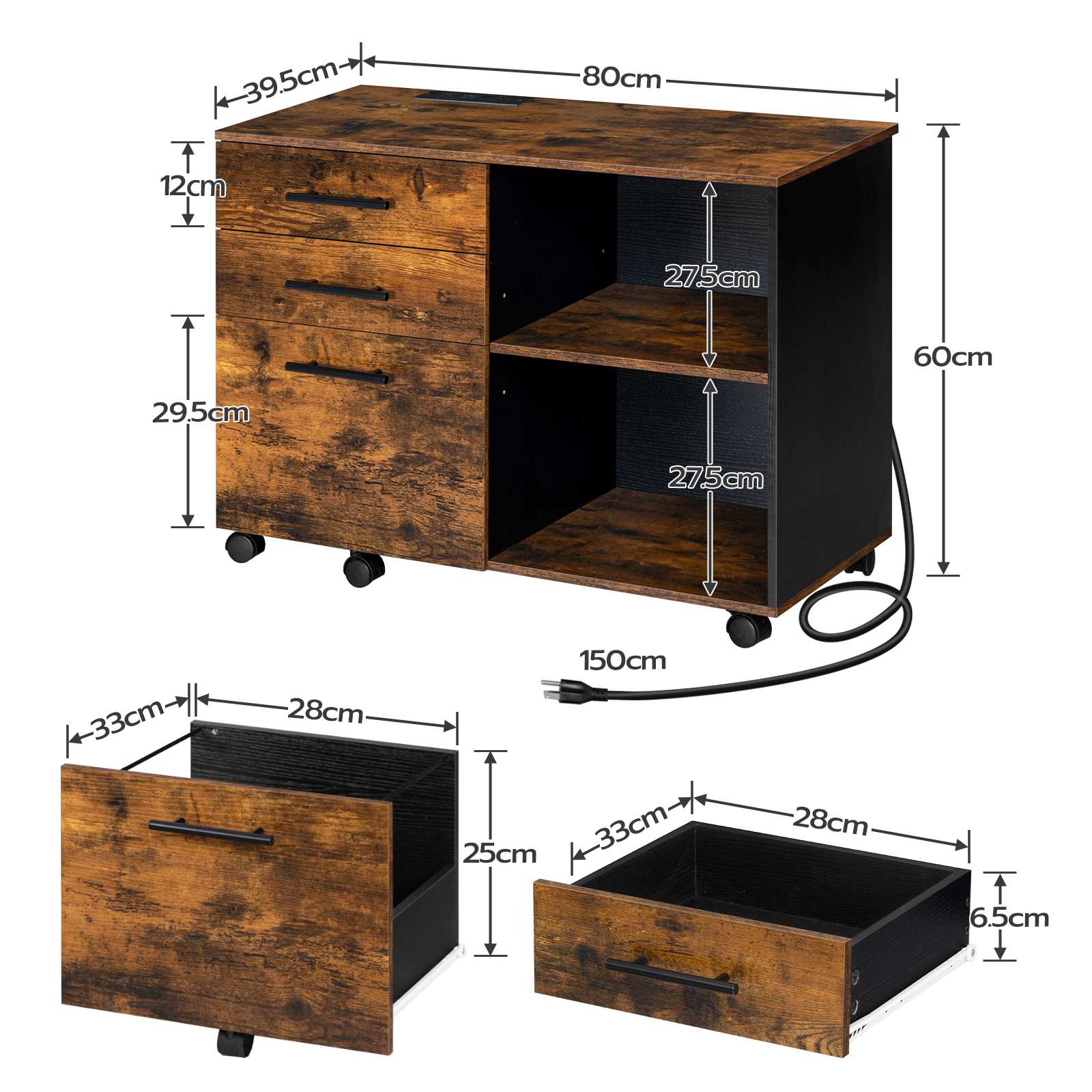 Integreret ladestation: The top of the filing cabinet is equipped with 2 standard stikkontakter og 2 USB-porte, accompanied by a 16.51cm power cord, enabling simultaneous charging of multiple electronic devices. This design eliminates the need to search for external power sources when devices require charging, enhancing office efficiency.