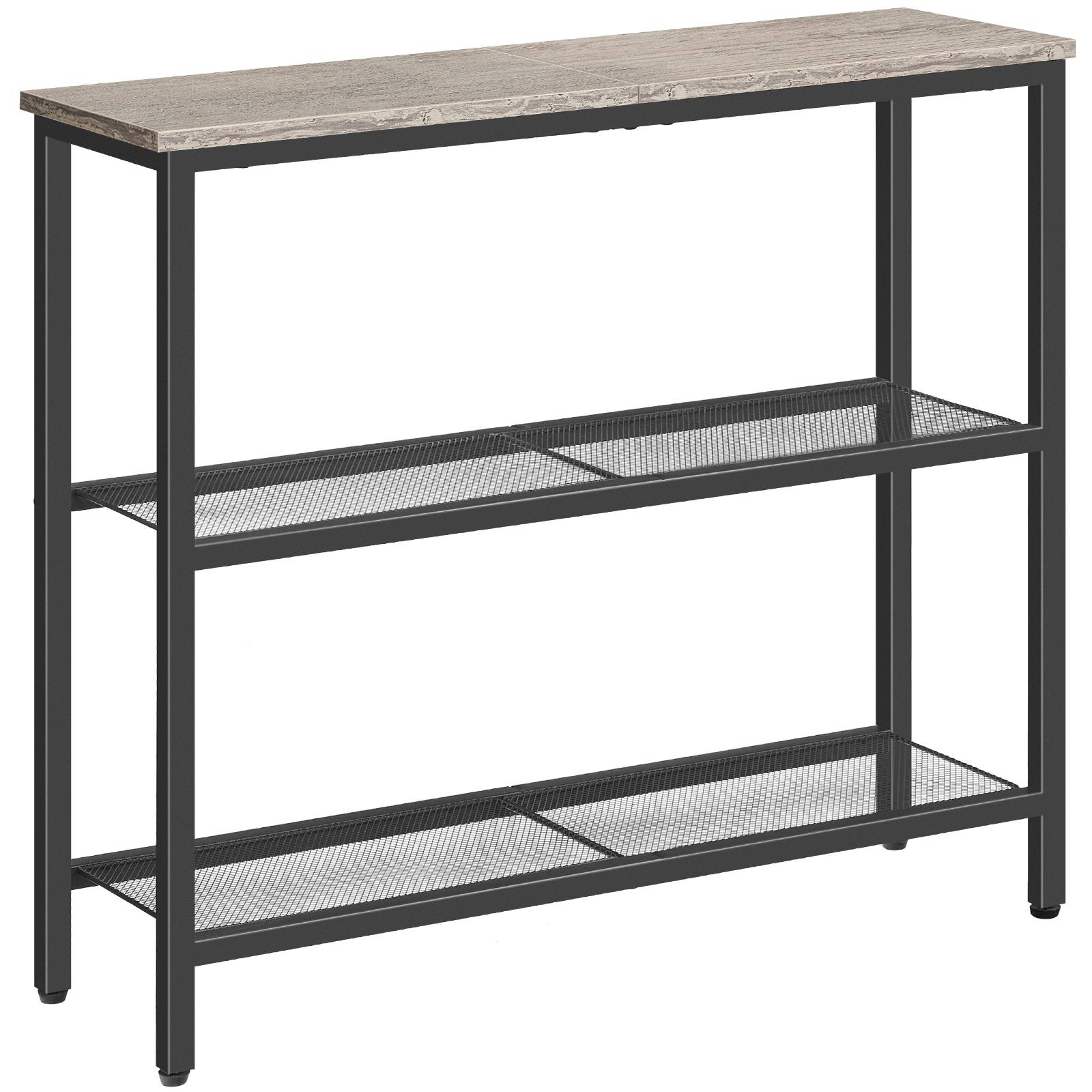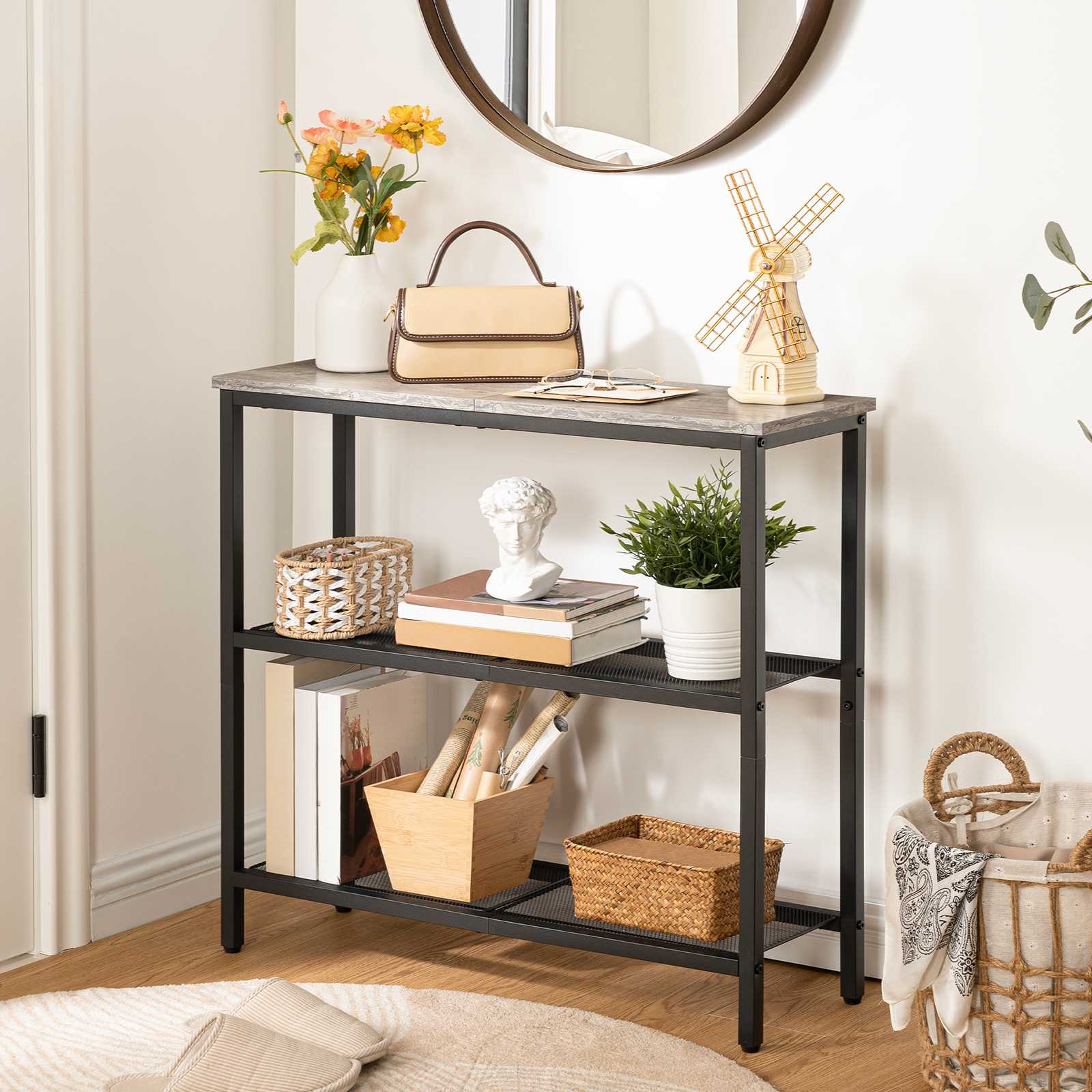 75cm smal konsolbord, 3-Tier indgangsbord, Tyndt sofabord med hylder, Multifunktionelt displayopbevaringsbord til entre, Indgang, Stue, Soveværelse, Grå og sort