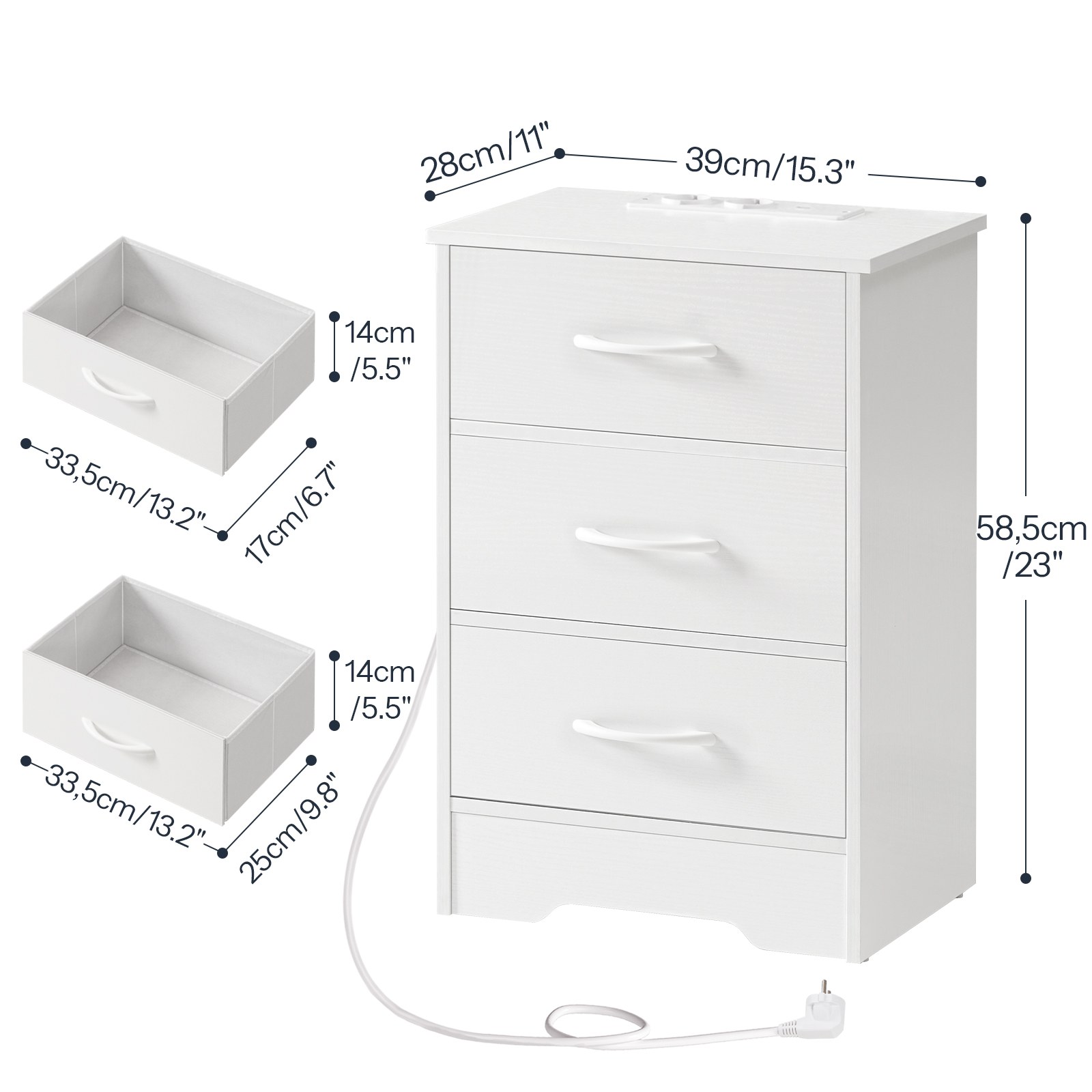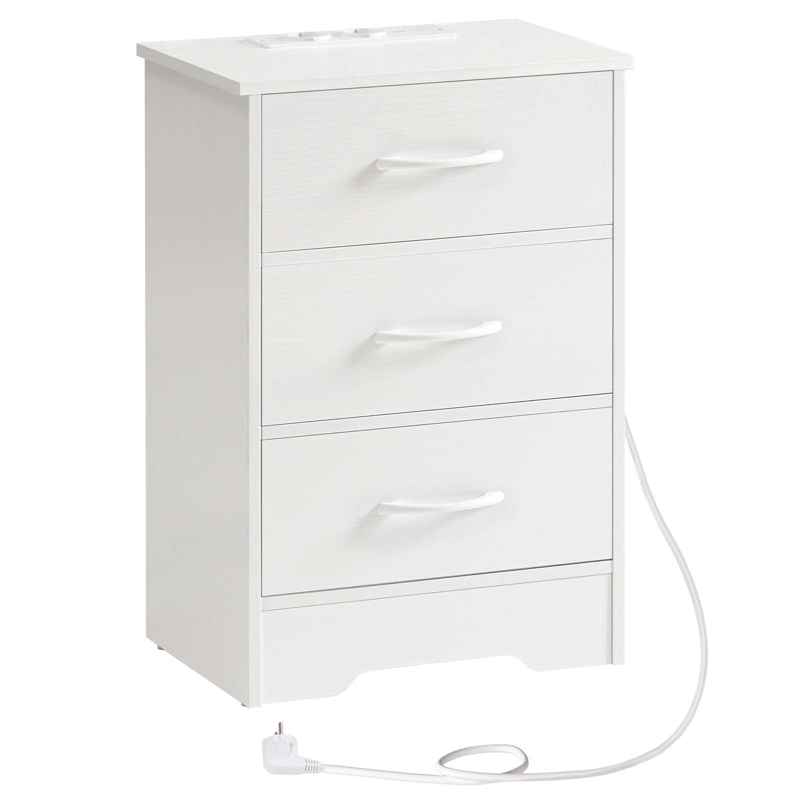 Sengbord med opladningsstation, Slim Side Table with 3 Ikke-vævede stofskuffer, Sofa Sidebord Udstyret med 2 Stikkontakter, 1 USB-A og 1 Type-C-port, Velegnet til stue og soveværelse, Hvid