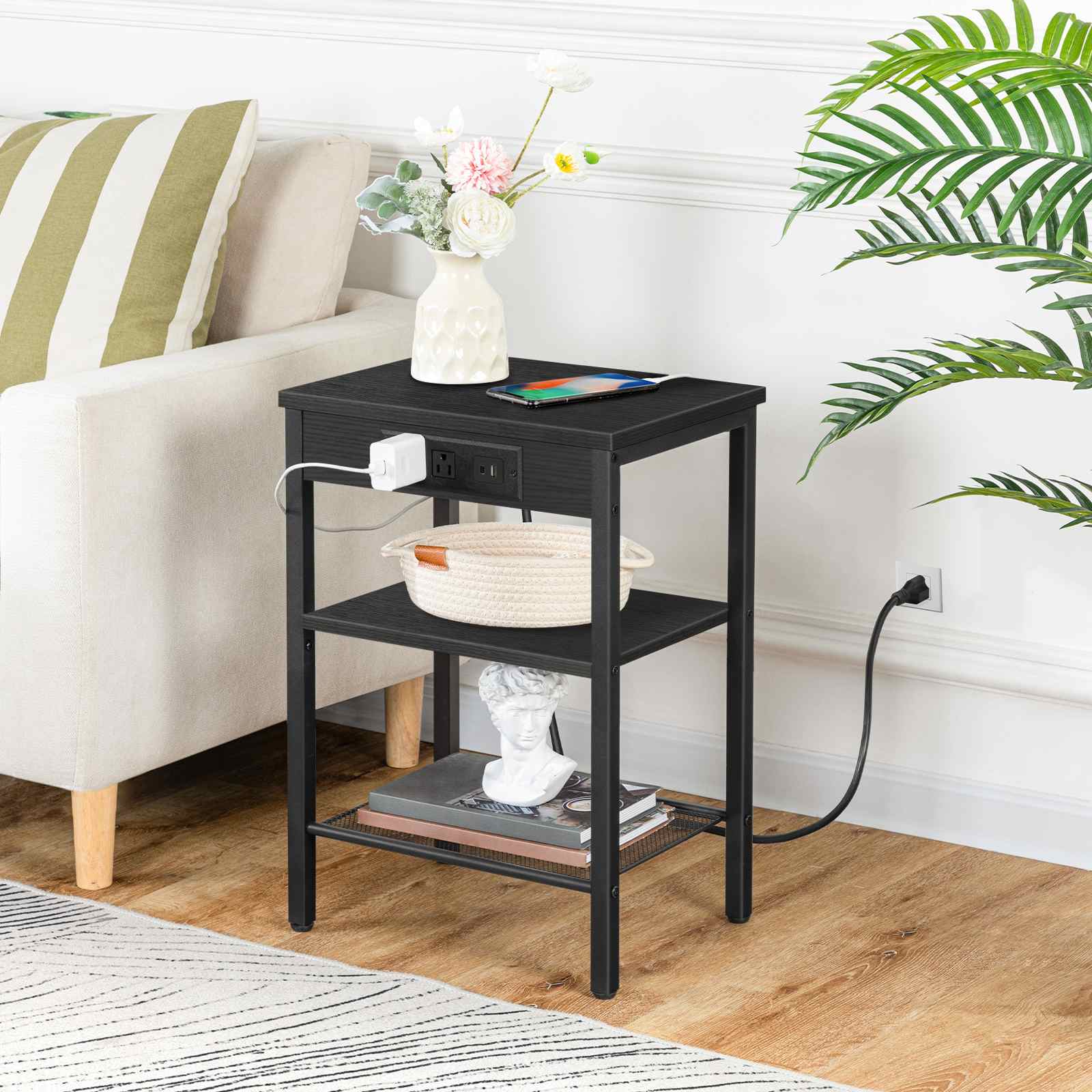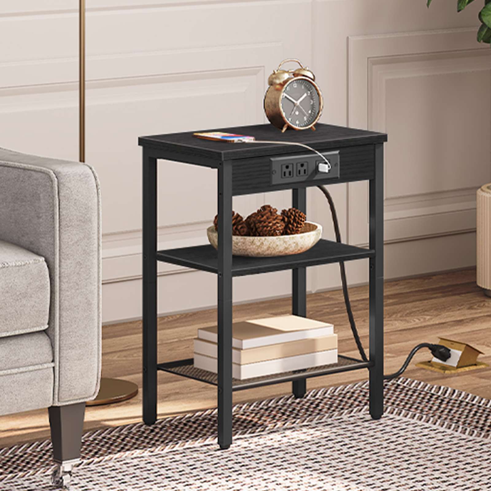 Dieser Beistelltisch ist in gestaltet 3 Ebenen, ausreichend für Ihre tägliche Aufbewahrung. Das Oberteil kann Ihren Wecker platzieren, Album, iPad, Snacks und andere Dinge des täglichen Bedarfs oder Ausstellungen. Das untere Regal ist ein zusätzlicher Raum für Bücher, Zeitschriften oder andere Gegenstände. die Ladestation mit 2 Steckdosen und 2 USB -Anschlüsse reicht aus, um Ihren Laptop aufzuladen, Telefon usw, Sparen Sie Zeit und Mühe, ohne nach USB -Ladekabel oder Steckdosen zu suchen.