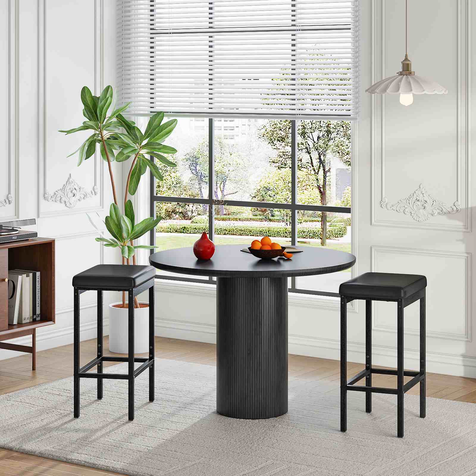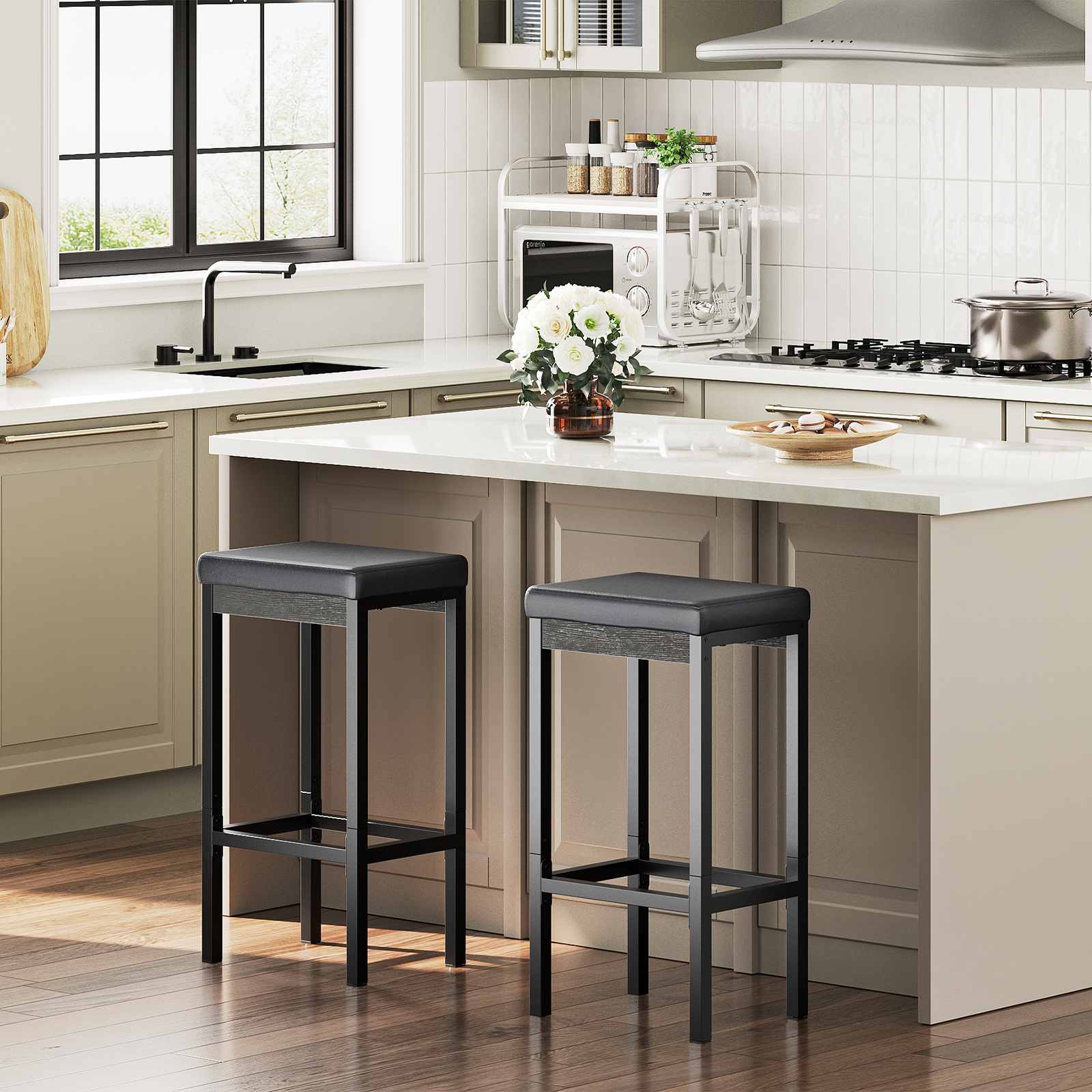 Stylish and Attractive Appearance: Designed in a modern style, each bar stool features a black PU surface that creates a soft visual contrast with the light-colored cabinets and countertops in kitchens, bars and other spaces, enhancing the overall aesthetic.