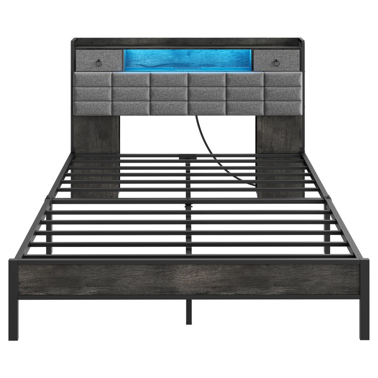 Holzkohlegrau Queen -Bettrahmen, Bettenrahmen mit Bücherregal -Speicher -Kopfteil und Ladestation, LED-Bettrahmen mit gepolstertem Kopfteil und 2-stufigen Regalen, Robuster Metallrahmen