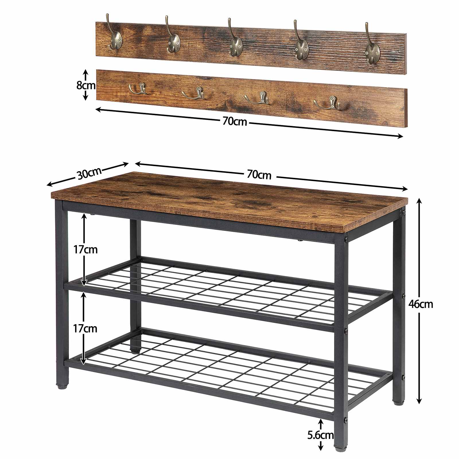 Perfectly Matched Dimensions: The coat rack measures 70 X 8 cm (L x B), and the shoe bench is 70 X 30 X 46 cm (L x B x H), featuring a seamless matching design. The two components work in conjunction to optimize entryway organization while occupying minimal space, achieving both practicality and space efficiency.