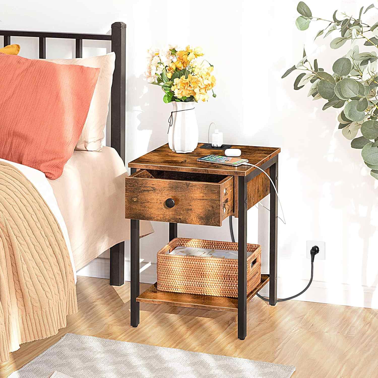 Nachttisch mit Steckdosen und USB-Anschlüssen, Multifunktionaler Beistelltisch mit Schublade und Ablagefach, Geeignet für Schlafzimmer, Rustikalbraun und schwarz