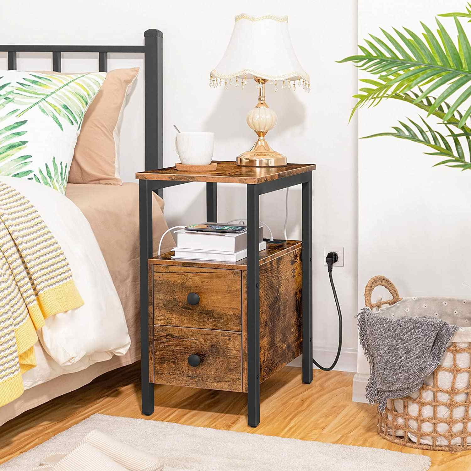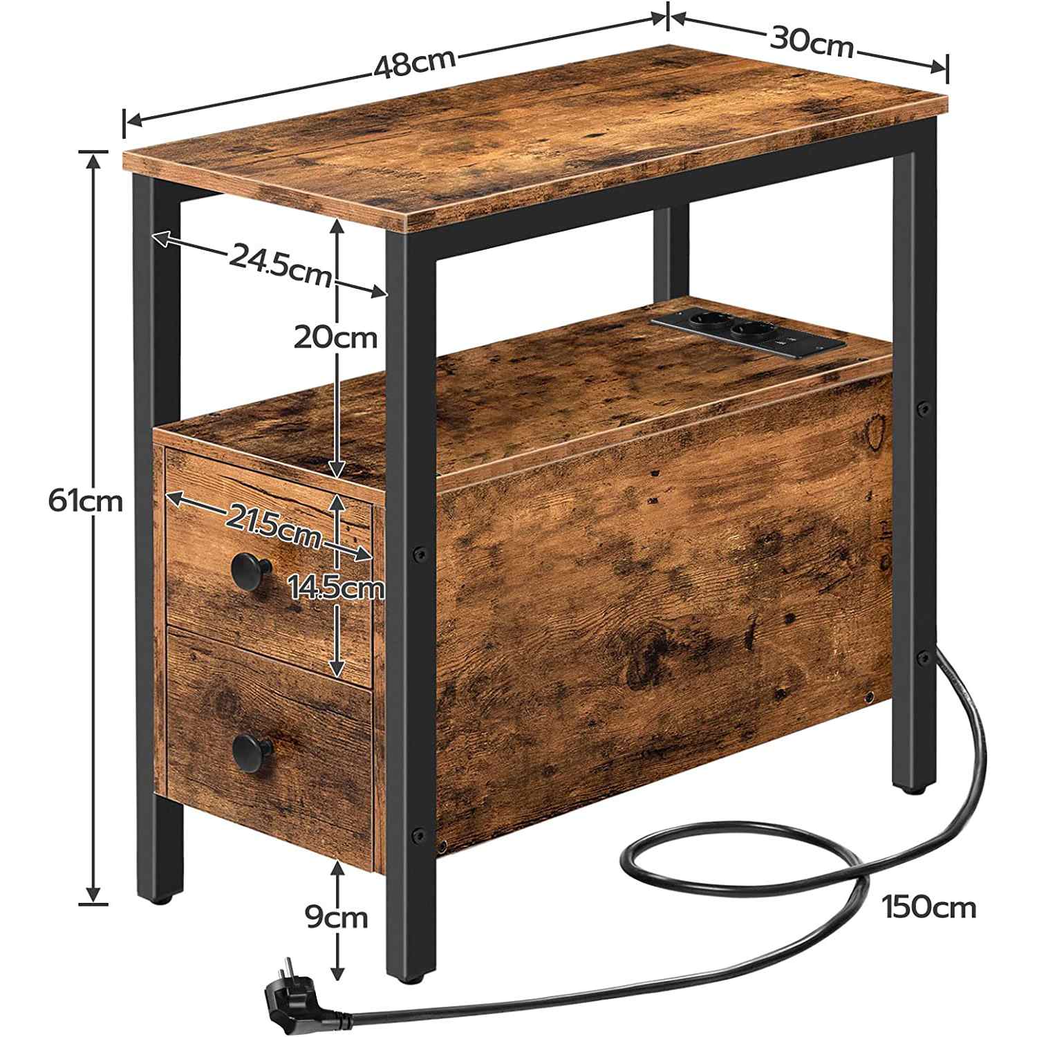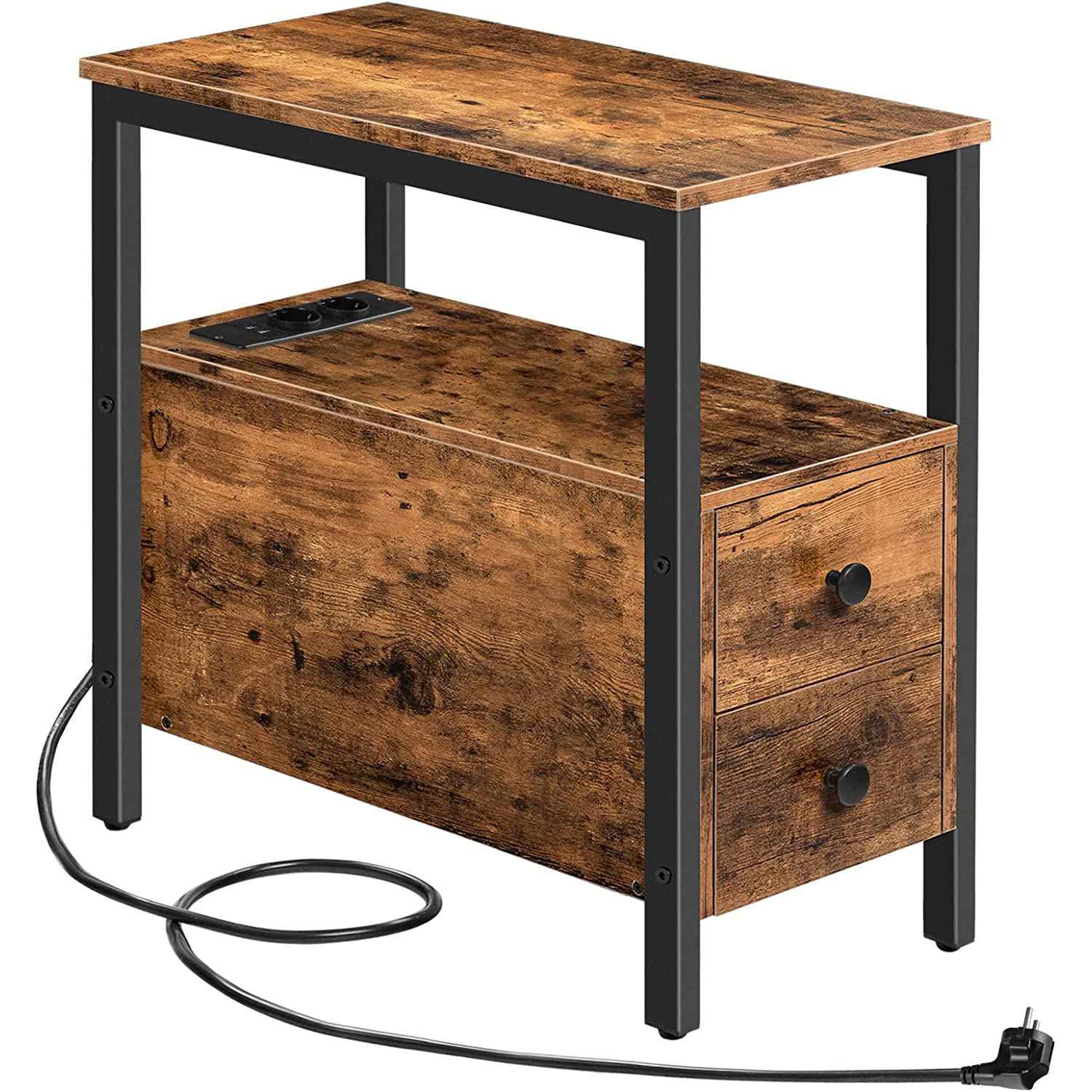 Beistelltisch mit Ladestation, Dunkelbrauner Sofa-/Nachttisch mit 2 Schubladen, USB-Anschlüsse und -Buchsen, Raumsparende, Stabil & Langlebig für das Wohnzimmer & Schlafzimmer