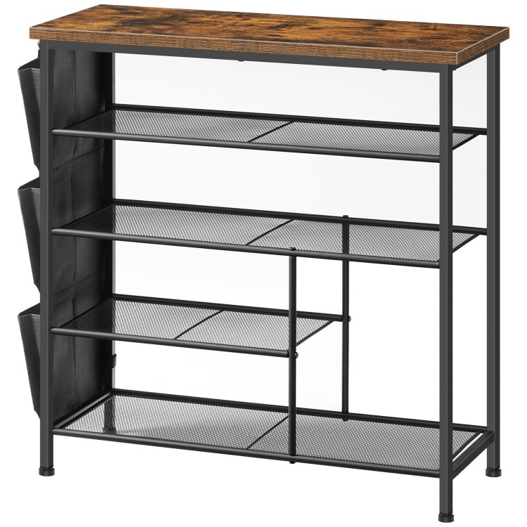 Schuhregal, 5-Etagen-Schuh-Organizer, Schuhregal mit seitlichen Hängetaschen, Schuhaufbewahrungsorganisator, Industrielle Schuhaufbewahrung für den Eingangsbereich, Metallrahmen, Rustikalbraun und schwarz