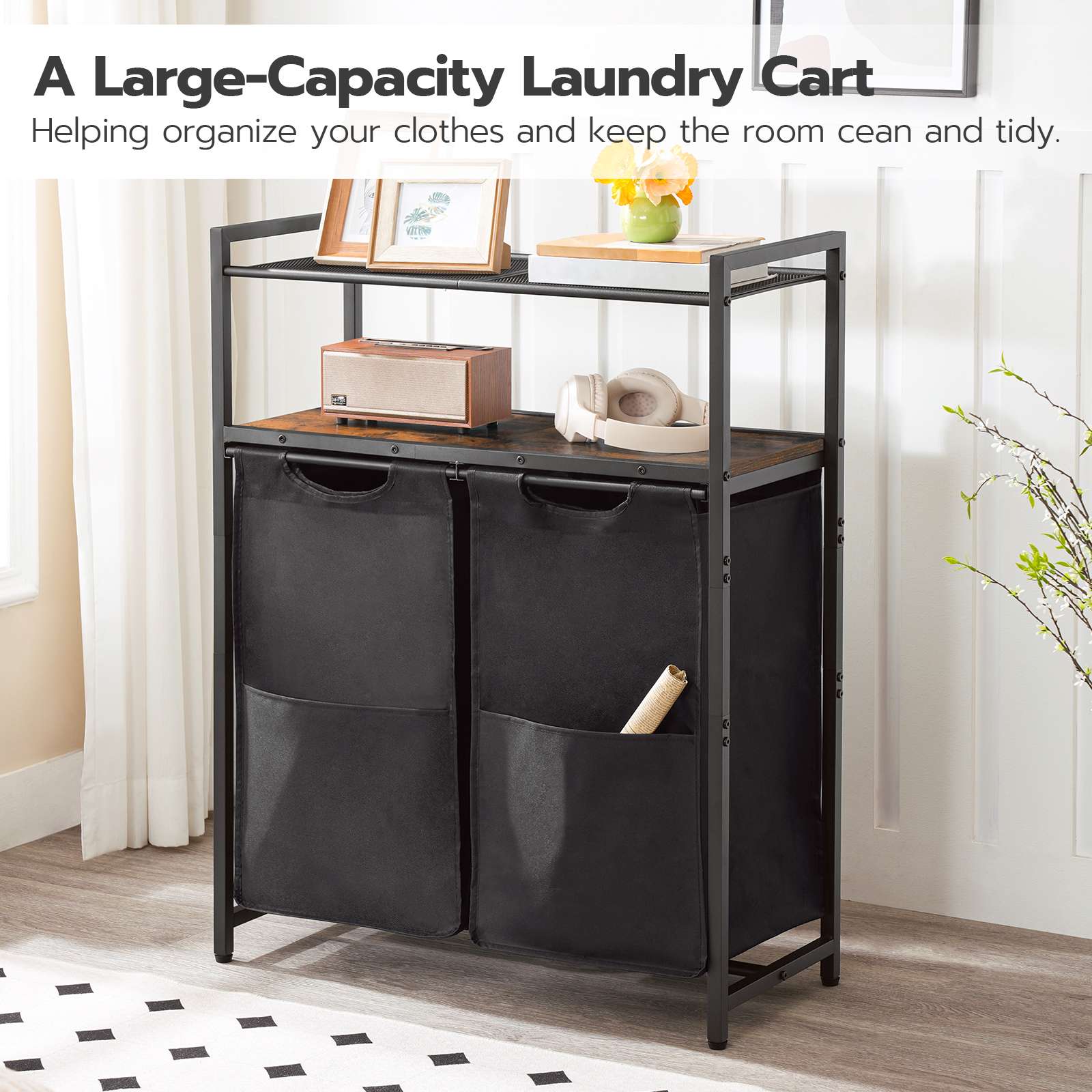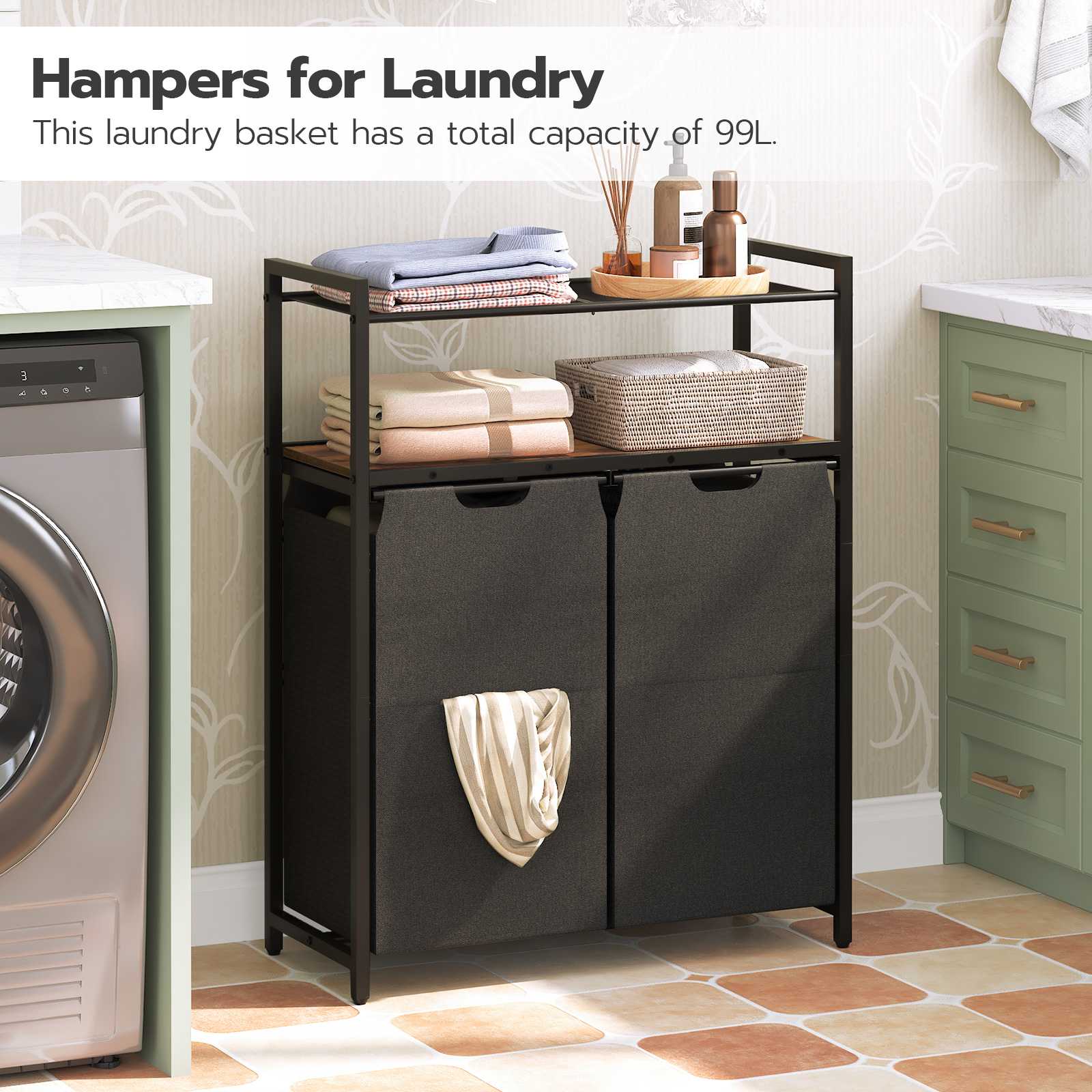Efficient Organization: The laundry hamper is equipped with 2 abnehmbare Taschen, with a total capacity of 100L, facilitating classification of light and dark garments. The laundry sorter measures 70cm (L) × 30cm (W) × 90cm (H) and is furnished with 2 offene Regale, providing additional storage space for daily necessities.