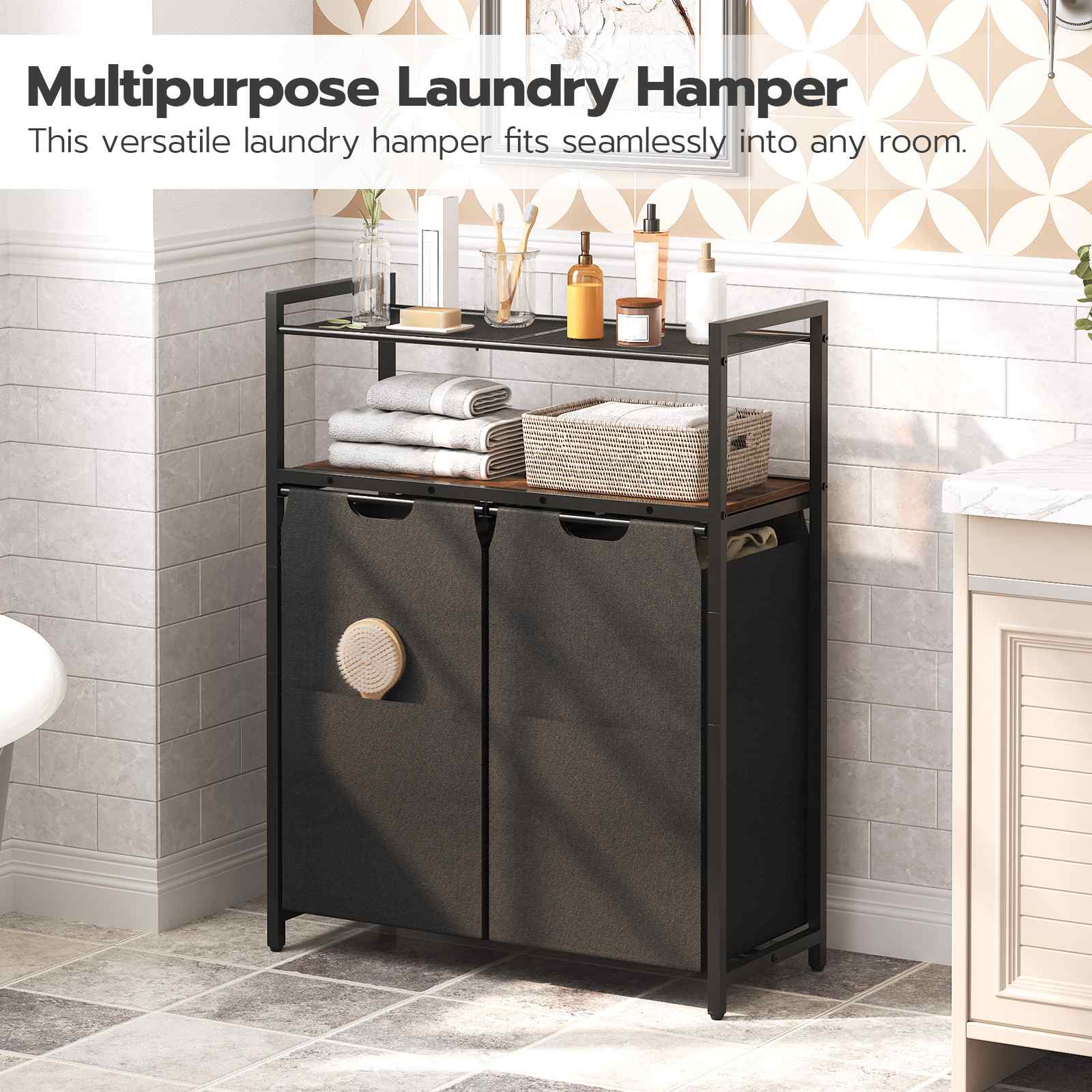 Versatile Practicality: This 2-bag laundry sorter is applicable to laundry rooms or bathrooms for organizing dirty clothes or bathing supplies. It can also be used in bedrooms or studies for storing seasonal items, serving as a multifunctional storage solution.